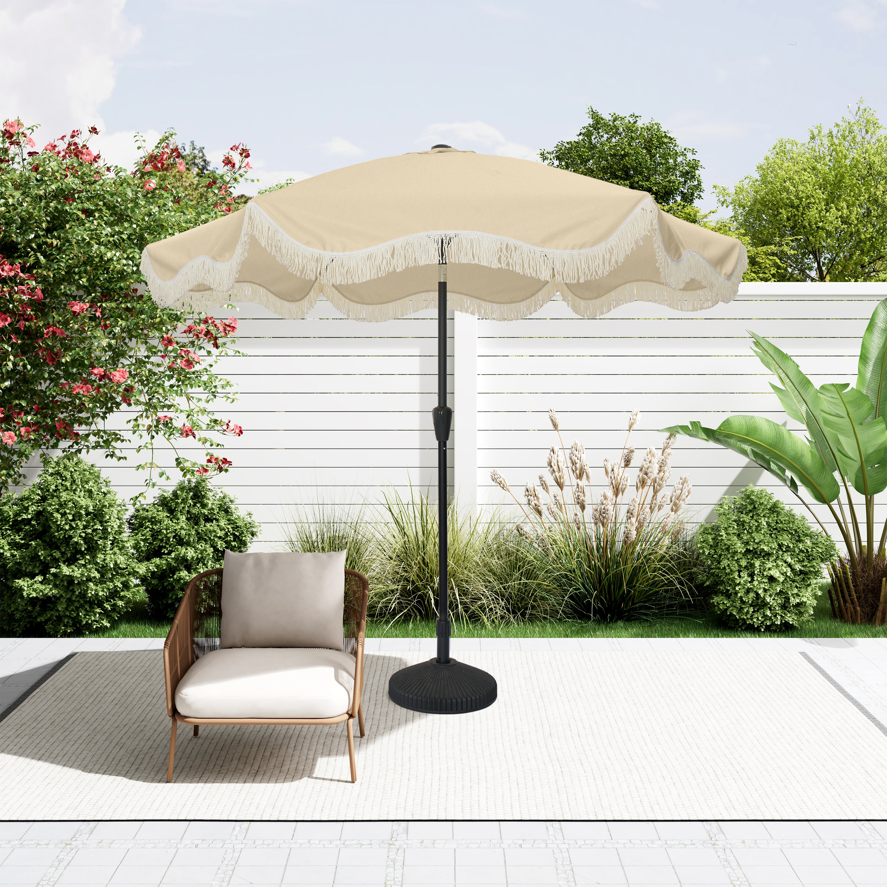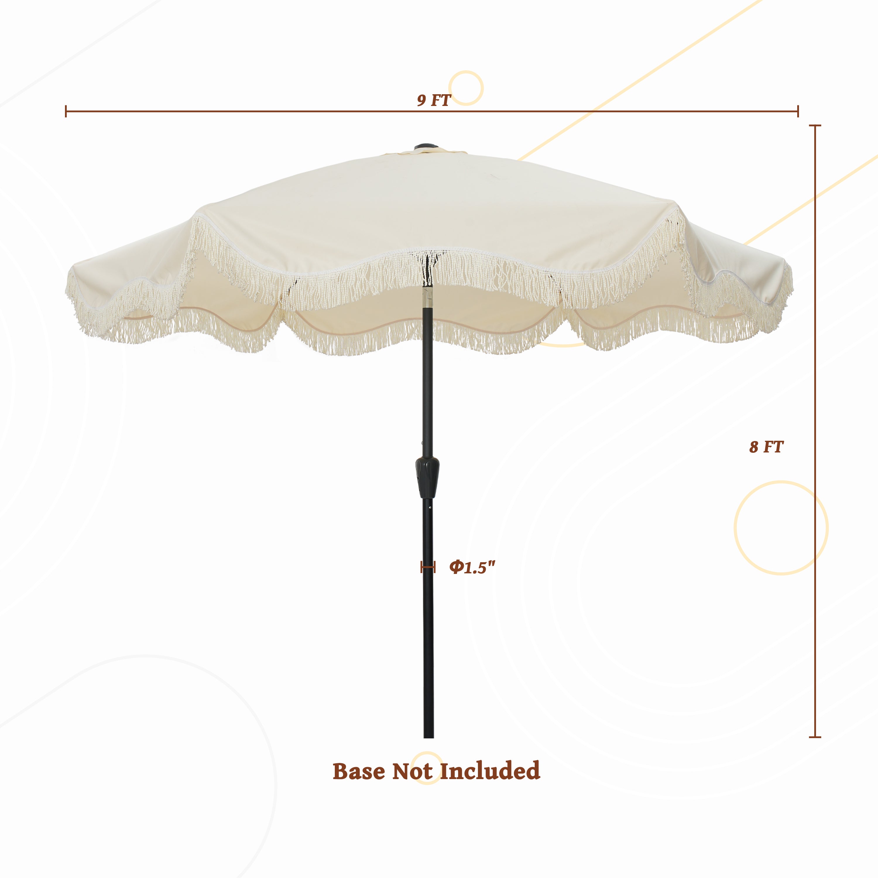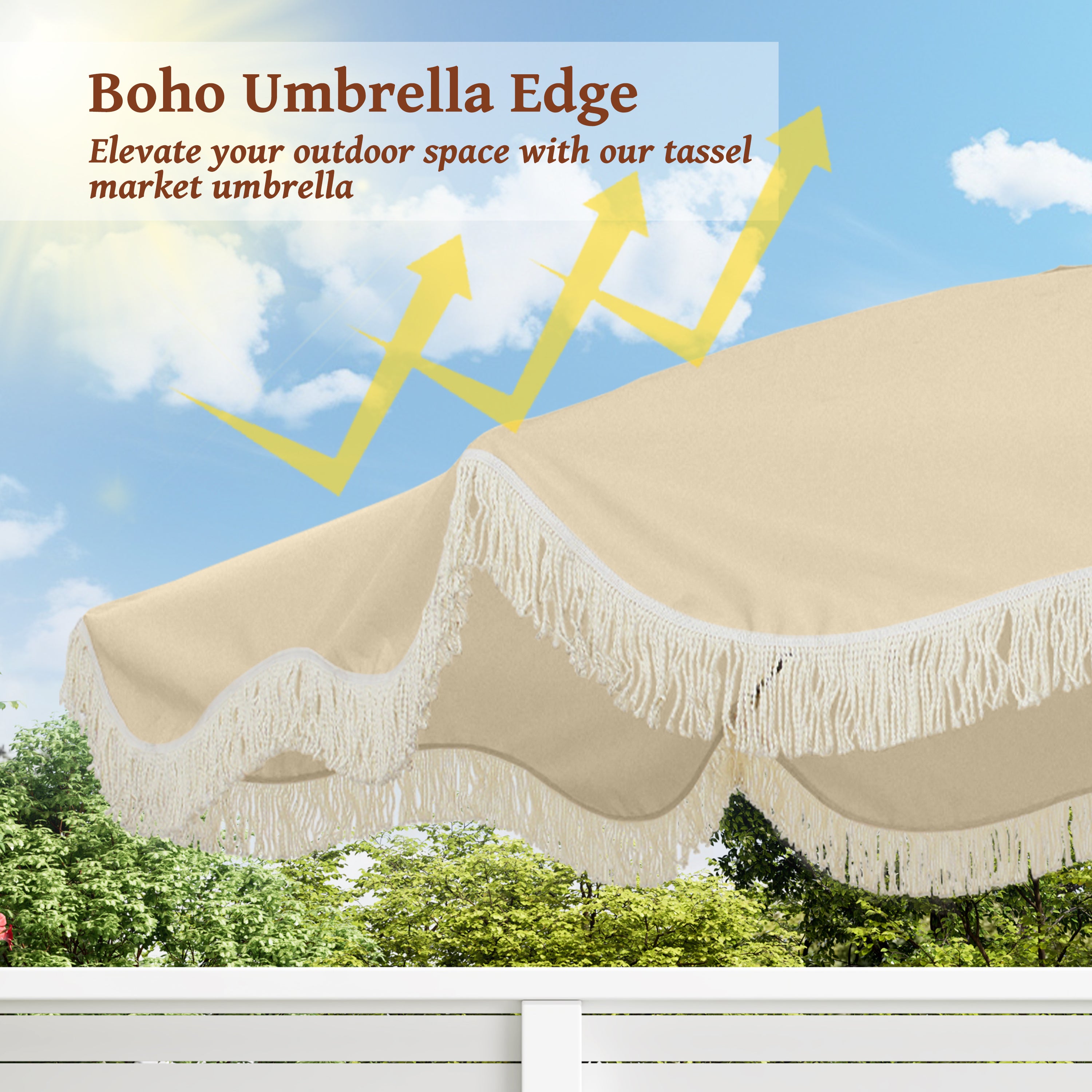 9 FT Tassel Market Patio Umbrella with Full Fiberglass Rib in Cream/Beige/Tan