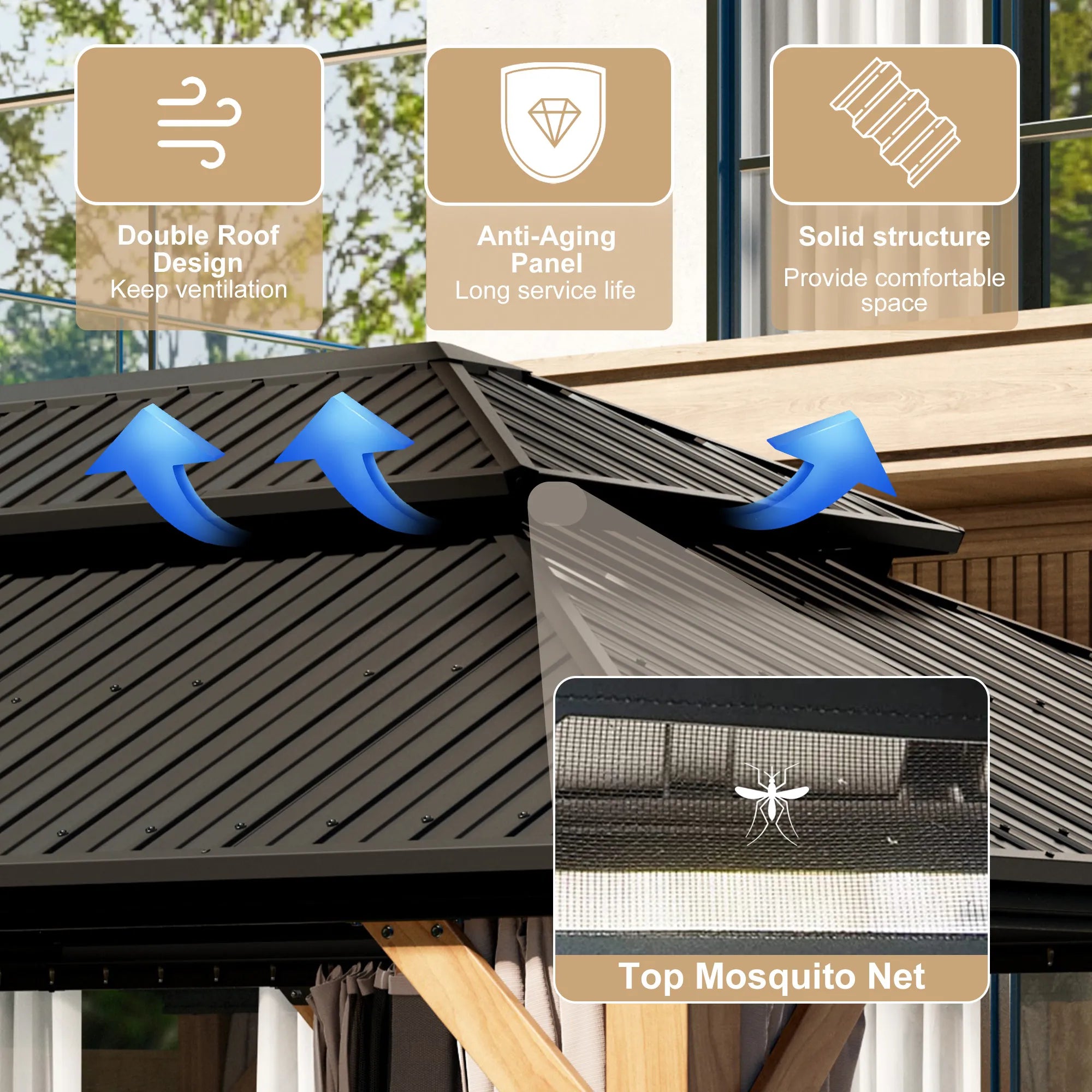 • Bug Netting & Privacy Curtains: The hardtop gazebo is designed with a double-track system and double-sided zipper for quick sliding. It comes with bugs netting, which maintains good ventilation and an open view while keeping insects out. Additionally, privacy curtains are provided, offering a safe and comfortable space for family and children and helping to keep the interior warm.