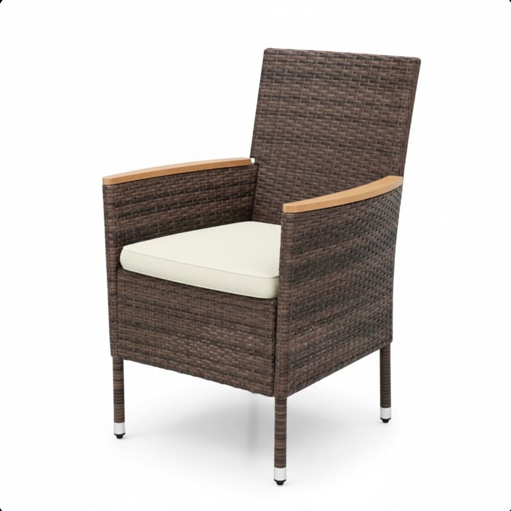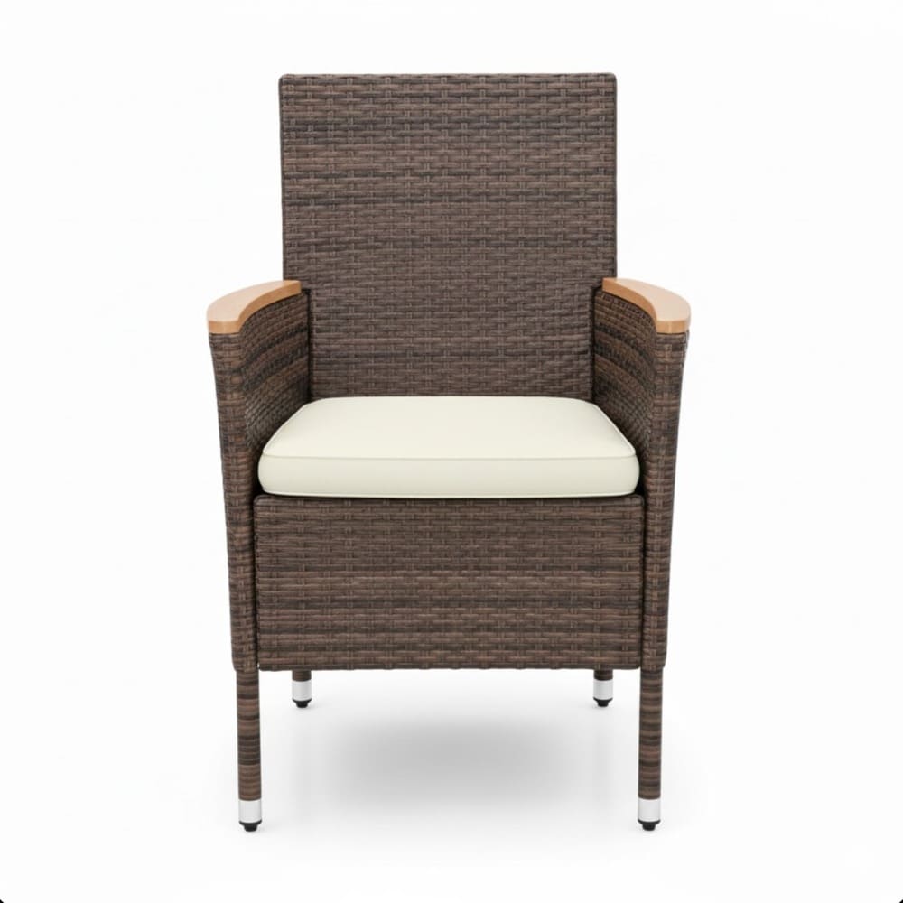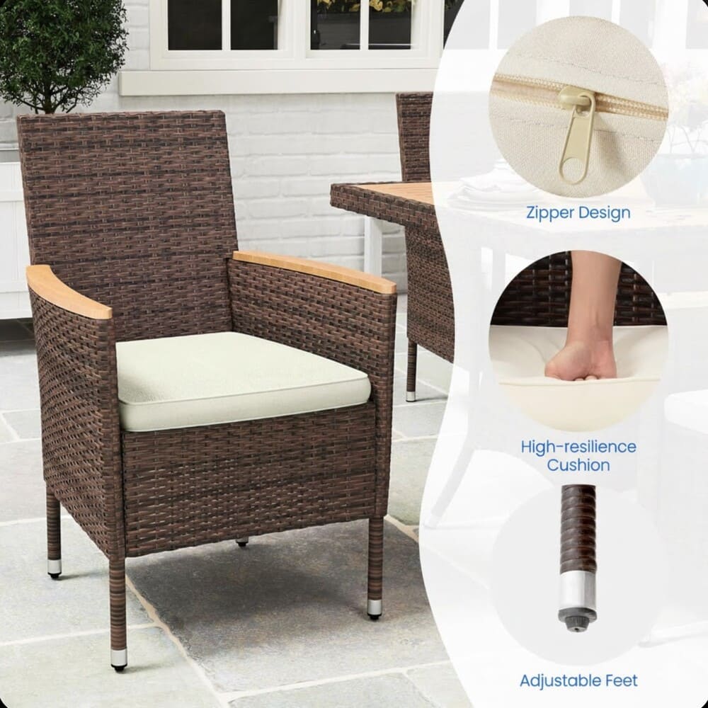 • • Modern Classic Elegant Design: Timeless brown rattan weaves with sleek lines blends simplicity and sophistication. Versatile style enhances gardens, backyards, decks, patios, or poolside – creates inviting, stylish outdoor dining retreats. • Easy Assembly & Low Maintenance: Clear step-by-step manual and all tools included for quick setup (faster with 2 people). Wipe-clean rattan, wood, and removable cushions require minimal care – enjoy more time dining outdoors year-round.