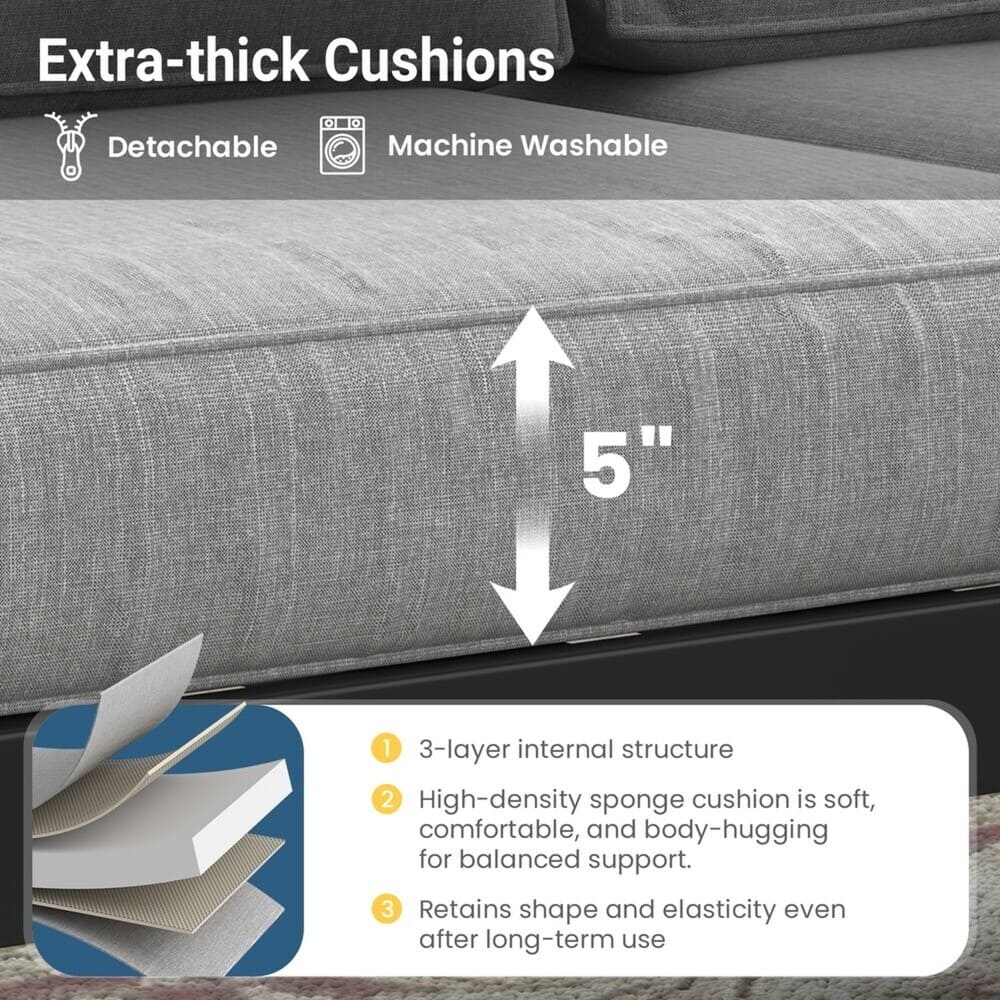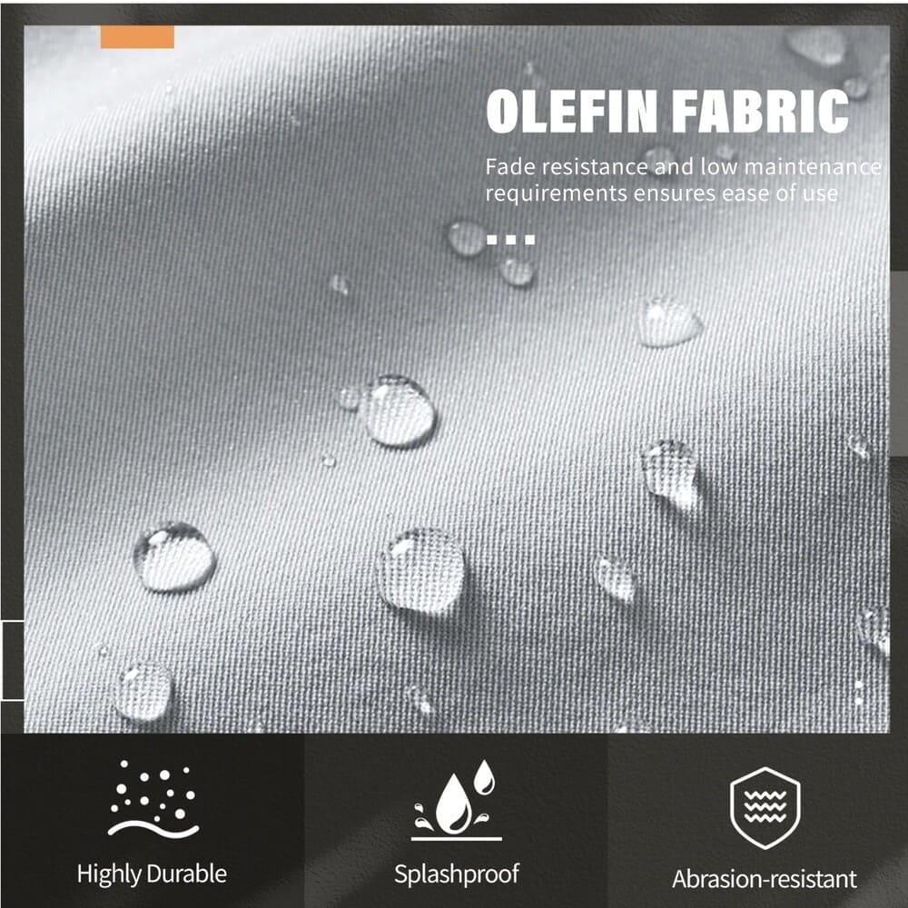 • • Plush 5-Inch Thick Olefin Cushions: Extra-deep 5" high-resiliency foam seat and lumbar-supportive back cushions covered in solution-dyed olefin fabric. UV-protected 5000+ hours, water-repellent, quick-dry, and fade-proof for all-season luxury comfort.