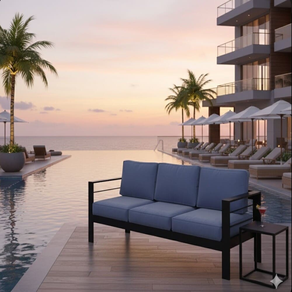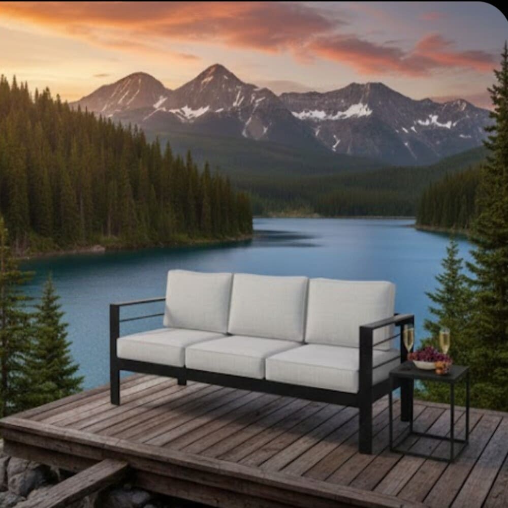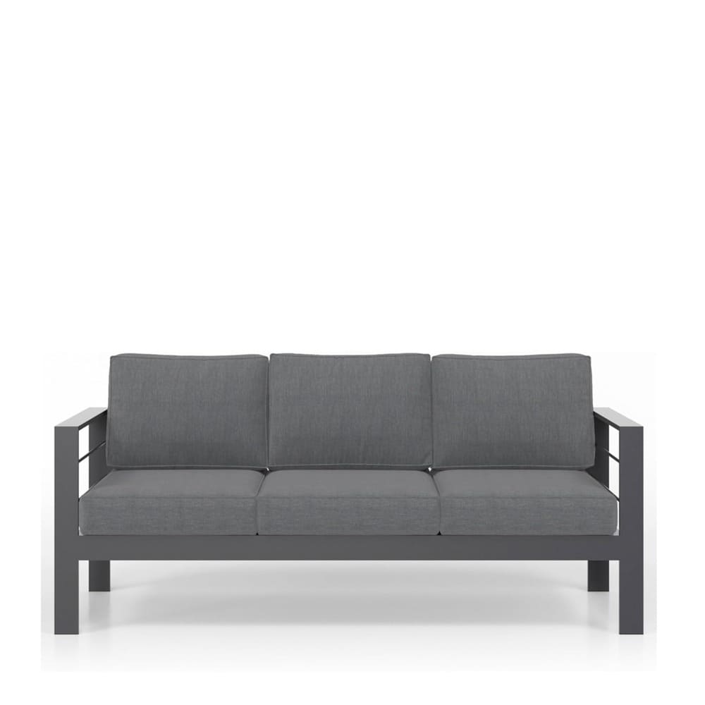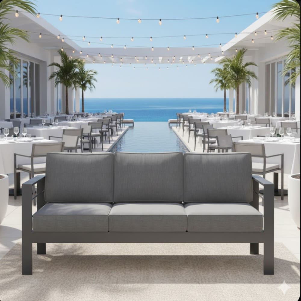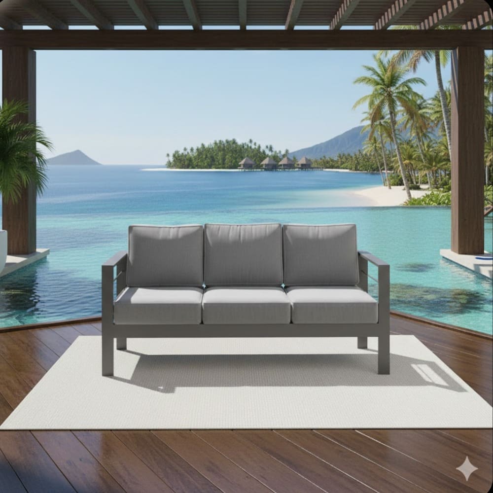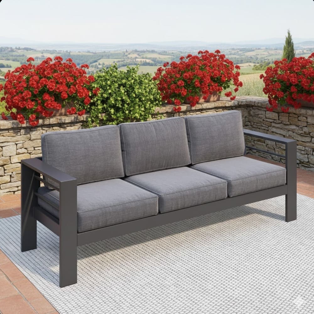 • Create the ultimate outdoor gathering spot with this premium 73-inch all-weather aluminum 3-seat patio sofa. Featuring a sleek black powder-coated frame and deep blue plush cushions, this modern outdoor couch delivers commercial-grade durability and luxurious comfort for patios, decks, porches, poolside areas, and gardens.