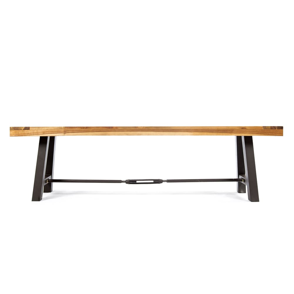 • Offer your outdoor seating ensemble an addition that you will not regret. Our sophisticated slat-panel bench brings a perfect amount of stylish comfort and modern industrial aesthetics to your backyard or patio. Featuring a durable powder-coated metal frame and a finished rich acacia wood top, our bench is an excellent addition to your outdoor decor.