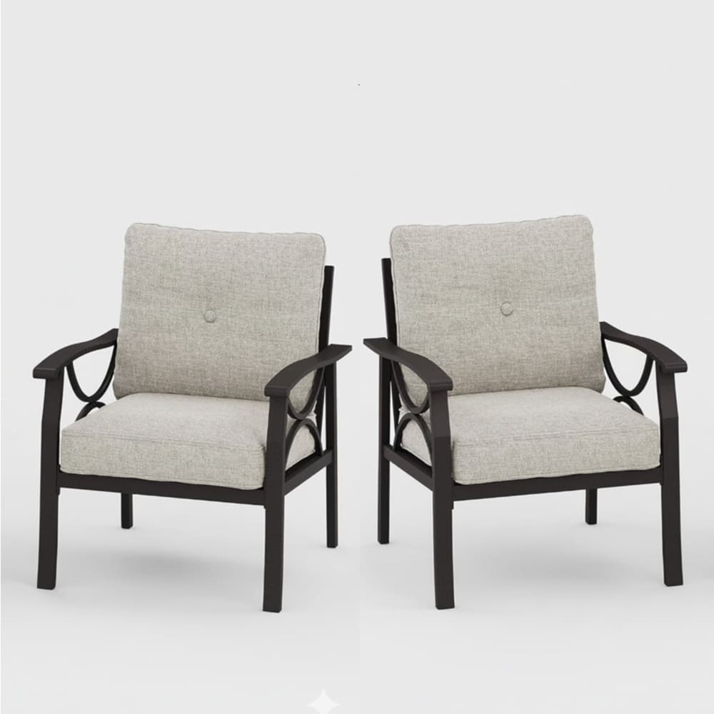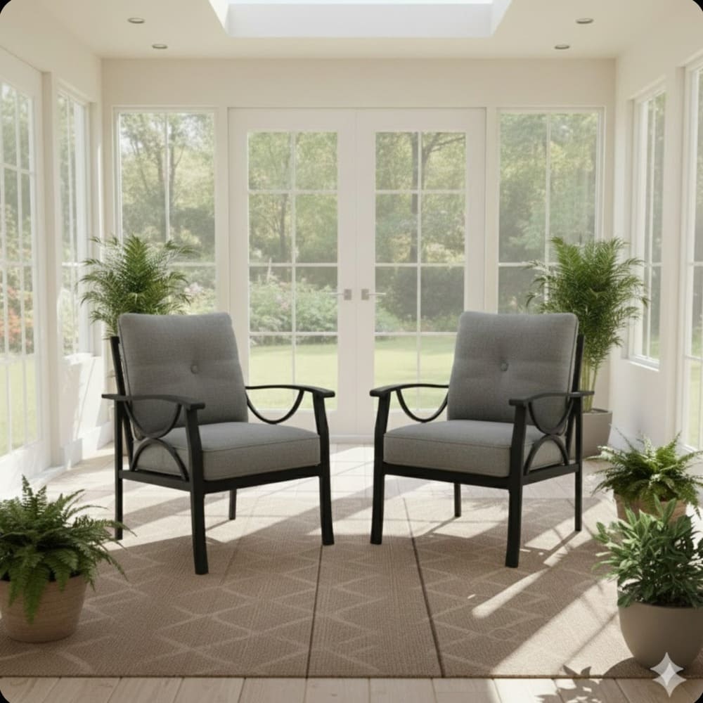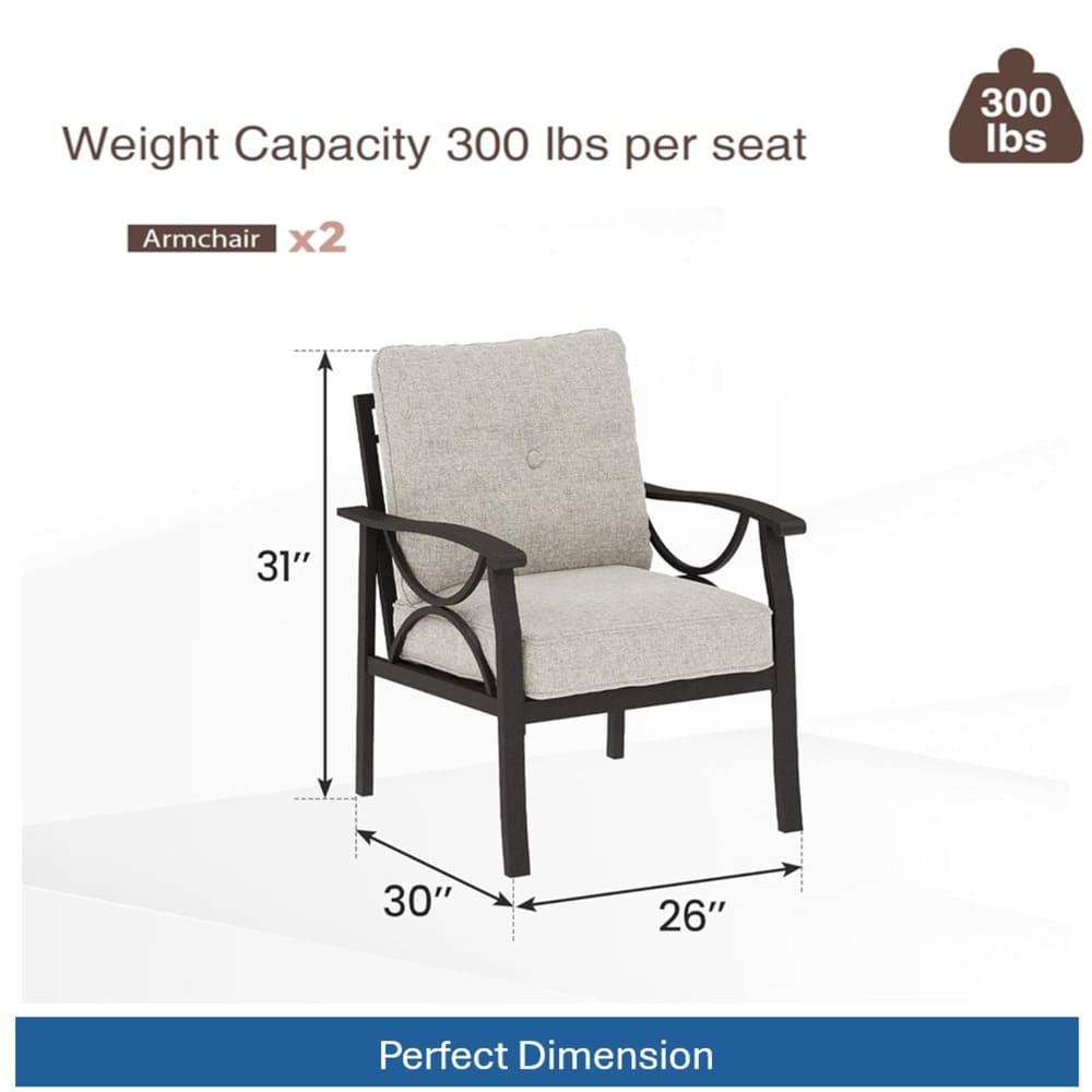 • Crafted from a heavy-duty powder-coated steel frame, the chairs are rust-resistant and built to withstand sun, rain, wind, and temperature changes without fading or corrosion. The ergonomic curved armrests provide optimal support for your arms, while the 4-inch-thick high-density foam cushions deliver cozy, resilient seating that maintains shape over time. Water-repellent polyester covers resist stains and spills, ensuring easy maintenance.