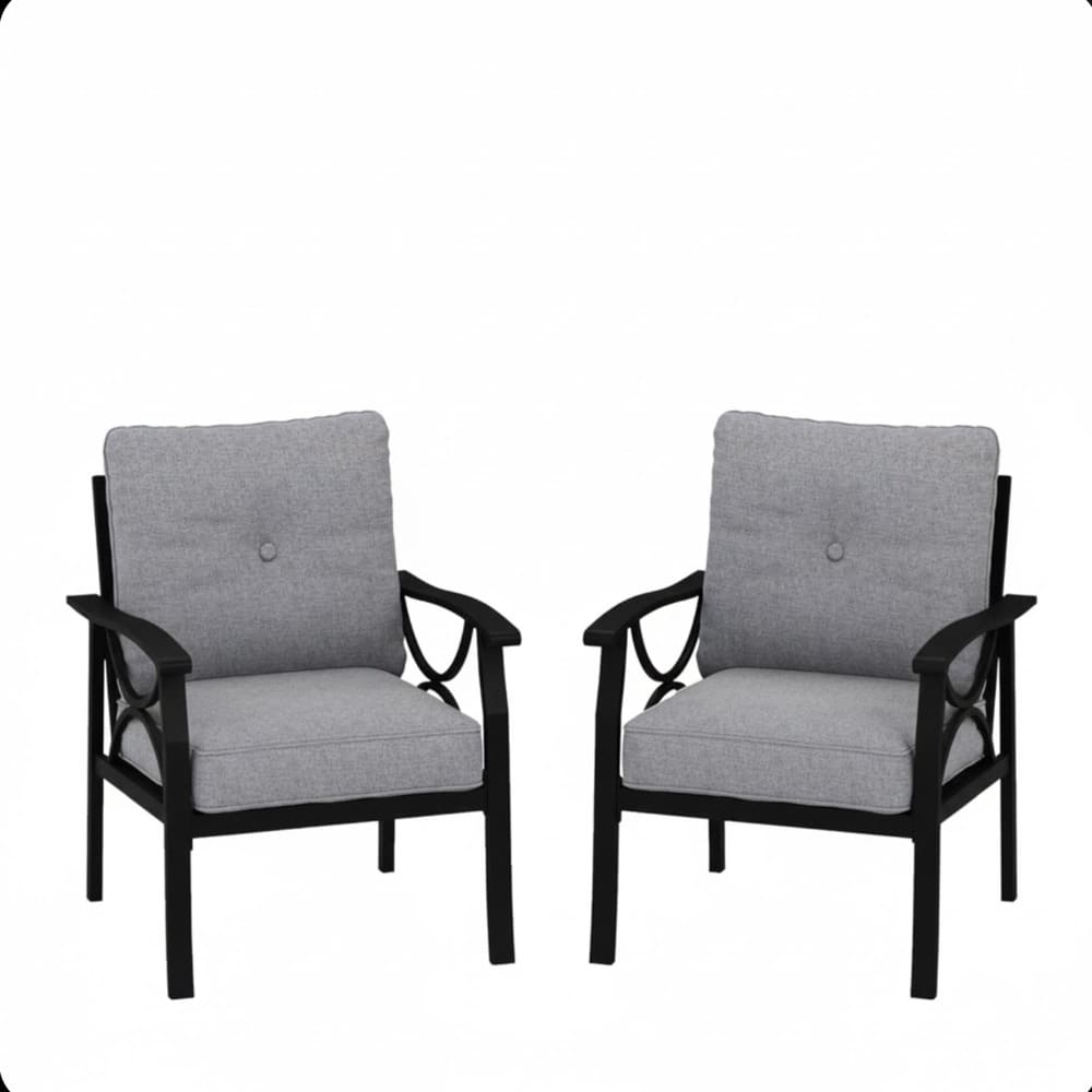 • Elevate your outdoor relaxation with this set of 2 stylish all-weather single metal armchairs in modern Black with plush gray cushions. Featuring elegant sculptural armrests and graceful contours, these chairs blend contemporary sophistication with exceptional comfort – perfect for patios, balconies, backyards, gardens, porches, poolside, or any outdoor space.