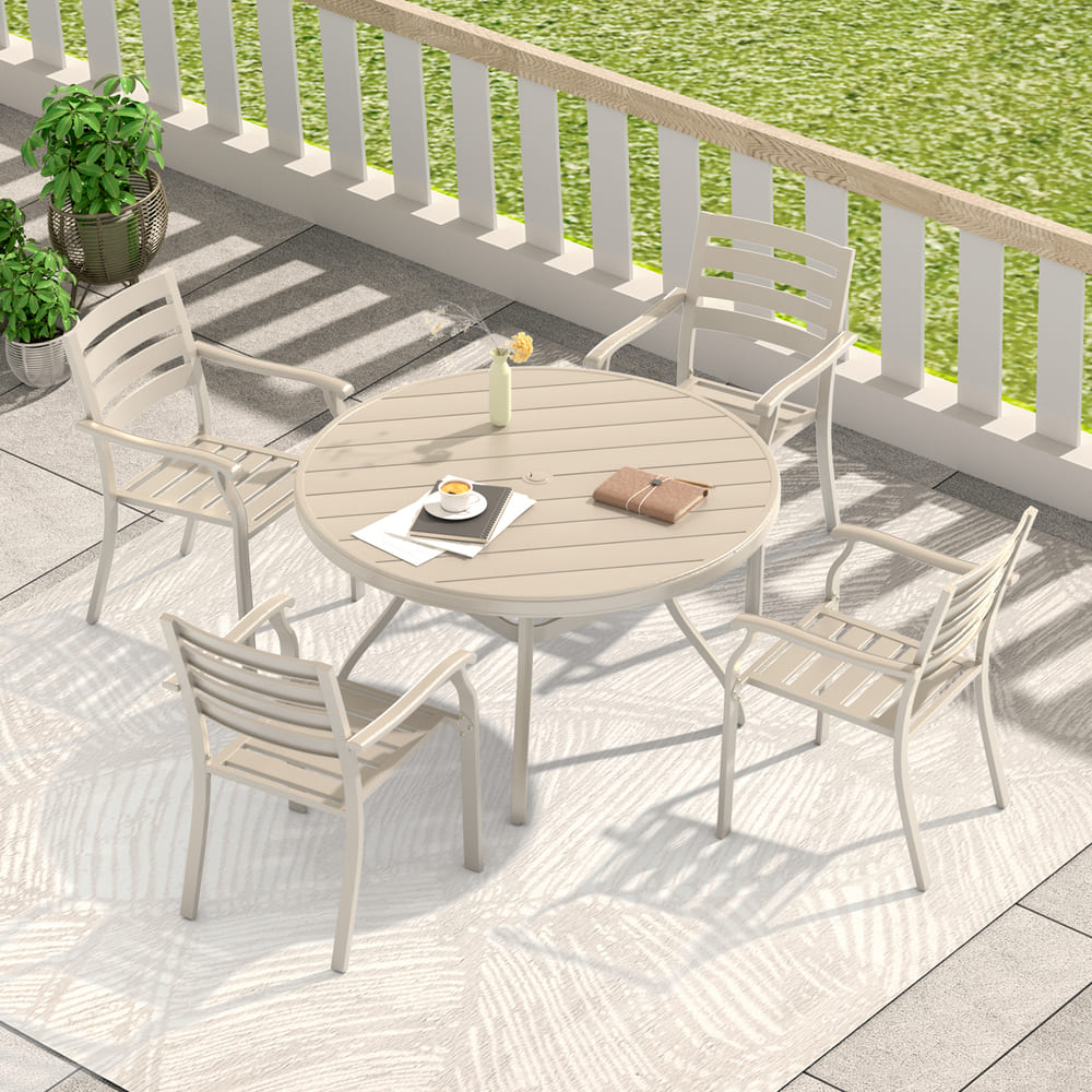 • 【Round Outdoor Dining Table】The spliced slatted metal tabletop leaves enough water seepage gaps to prevent water accumulation and is easy to clean. The 1.57"-1.9" adjustable umbrella hole fits most umbrellas, protecting you from UV rays or rain