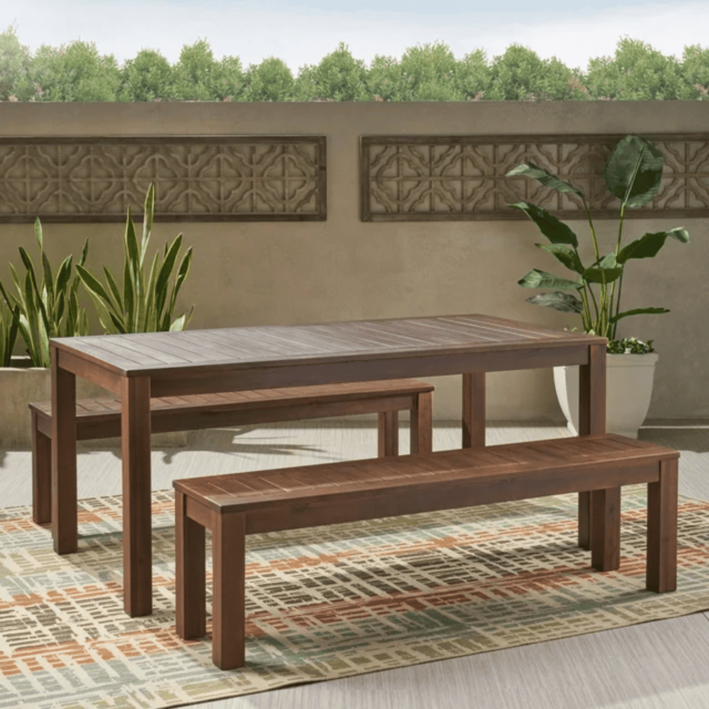 Elevate your outdoor space with this Outdoor Courtyard Table and Bench set, crafted from premium acacia wood. Acacia wood's durability and weather resistance make it perfect for outdoor use, ensuring the set withstands various conditions and lasts for seasons. The natural wood finish brings a cozy, rustic charm to your courtyard, patio, or garden. With a simple yet stylish design, it seamlessly fits any outdoor decor. The table and benches offer ample space for seating and dining, ideal for gatherings with family and friends.