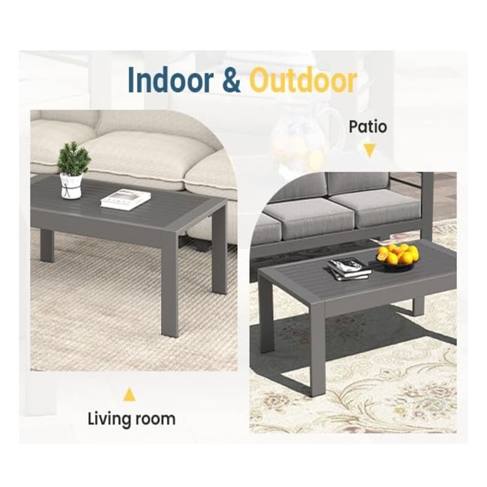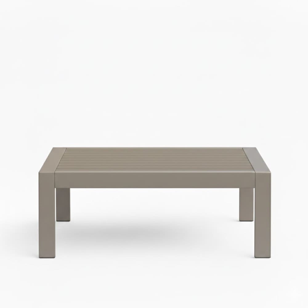 • Add timeless style and reliable functionality to your outdoor space with this spacious 43" x 24" all-weather metal coffee table in elegant khaki with a realistic wood-look tabletop. Perfect for decks, gardens, backyards, patios, balconies, porches, or poolside areas, this rectangular table blends modern sophistication with exceptional durability and practicality for year-round use.