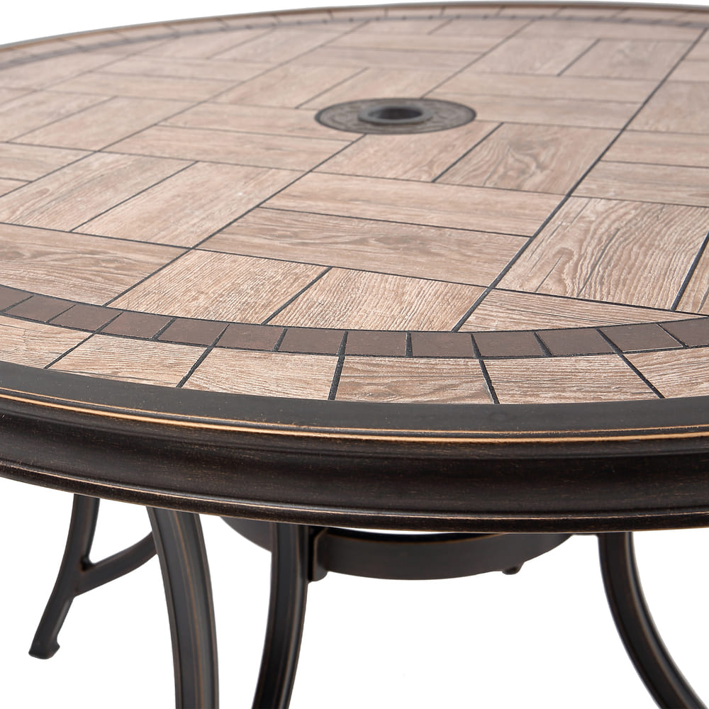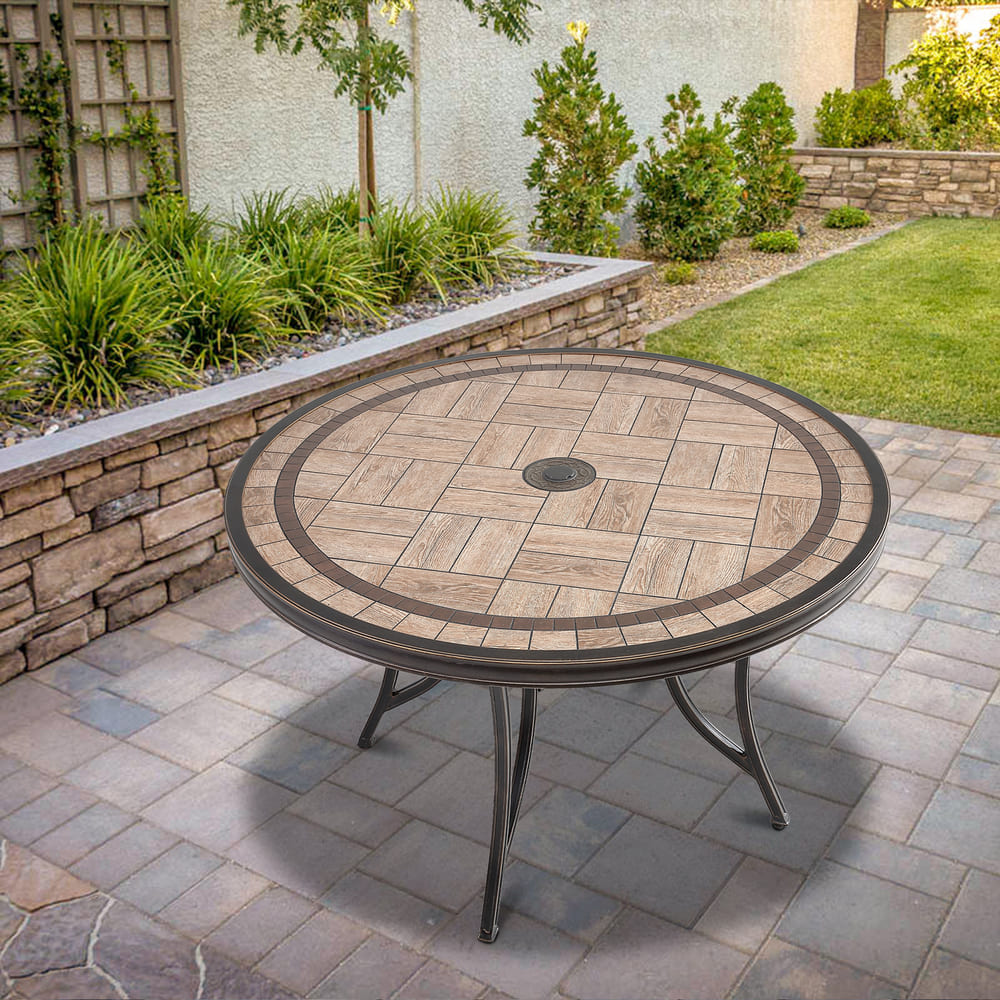 Elevate your patio dining experience with this 48-inch antique bronze round tile-top table. Designed with a built-in umbrella hole and durable powder-coated frame, it offers weather resistance and timeless style—perfect for outdoor gatherings, garden lunches, or evening cocktails