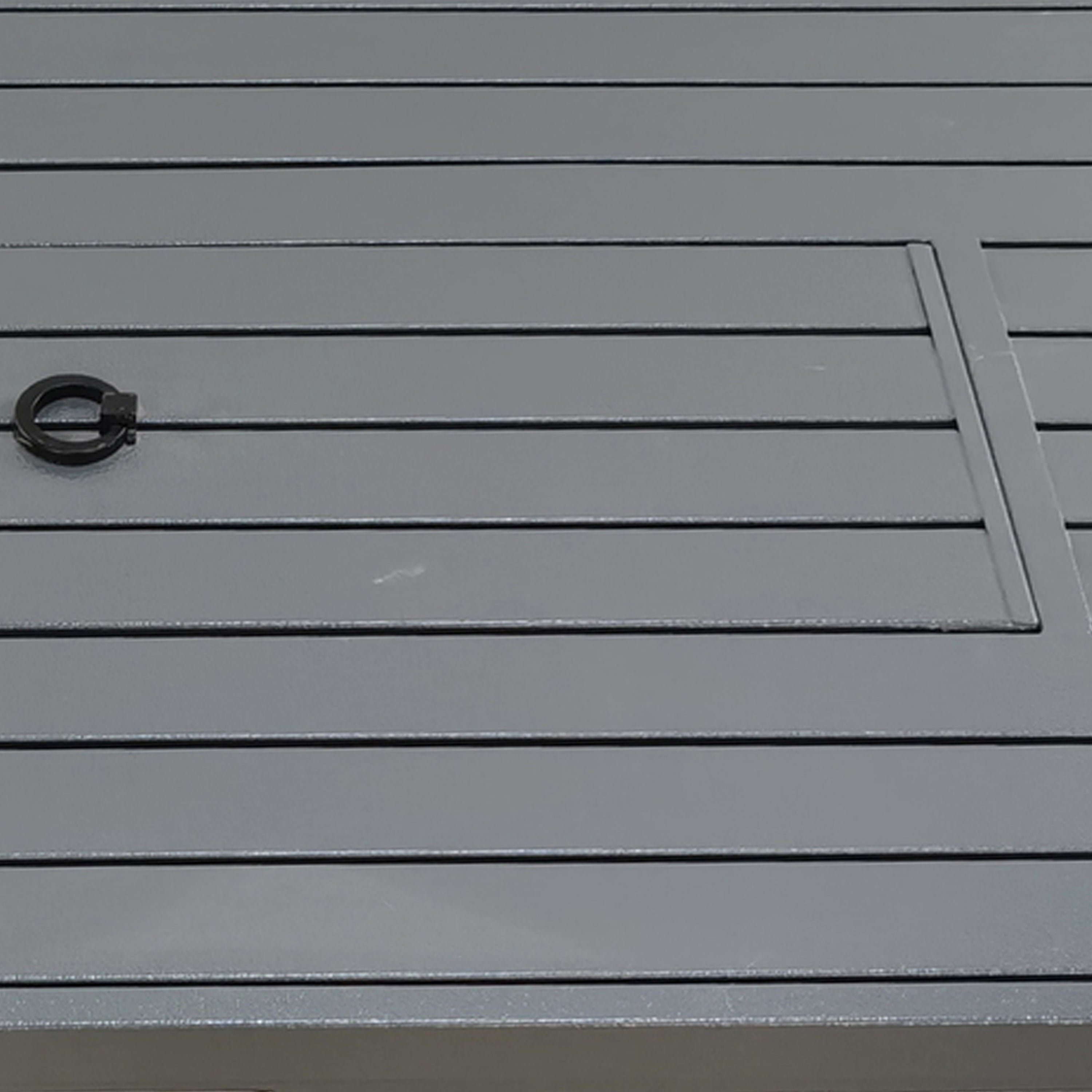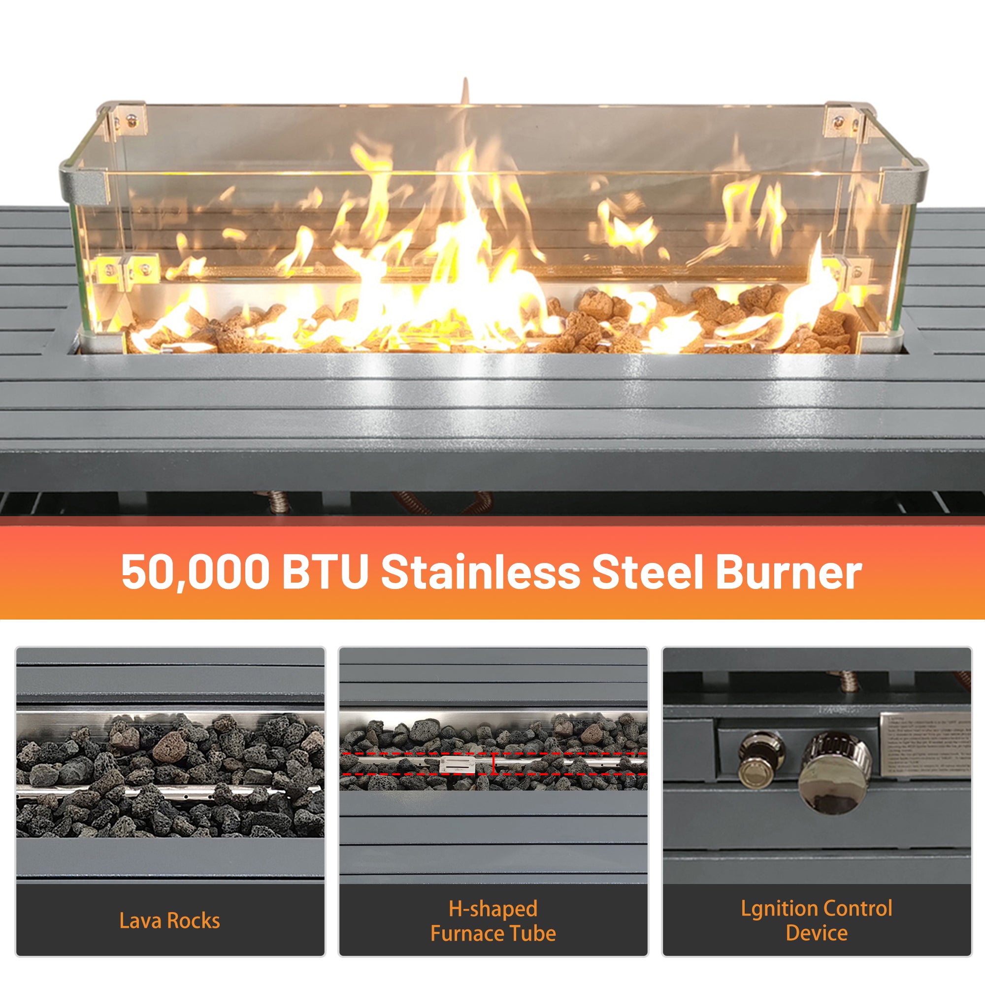 This outdoor fire pit table creates a cozy focal point in any backyard or patio space. Its a rectangular shape, with Steel construction in a slatted style, with a heat- and weather-resistant powder-coated finish. This fire pit is fueled by propane; it turns on with the push of a button and offers a 50000 BTU output, an adjustable flame, and an eight-hour burn time. The rectangular well in the center of this unit is filled with lava rocks. It includes batteries, as well as a protective cover. This fire pit accommodates a 20 lb. Gas tank (not included).
