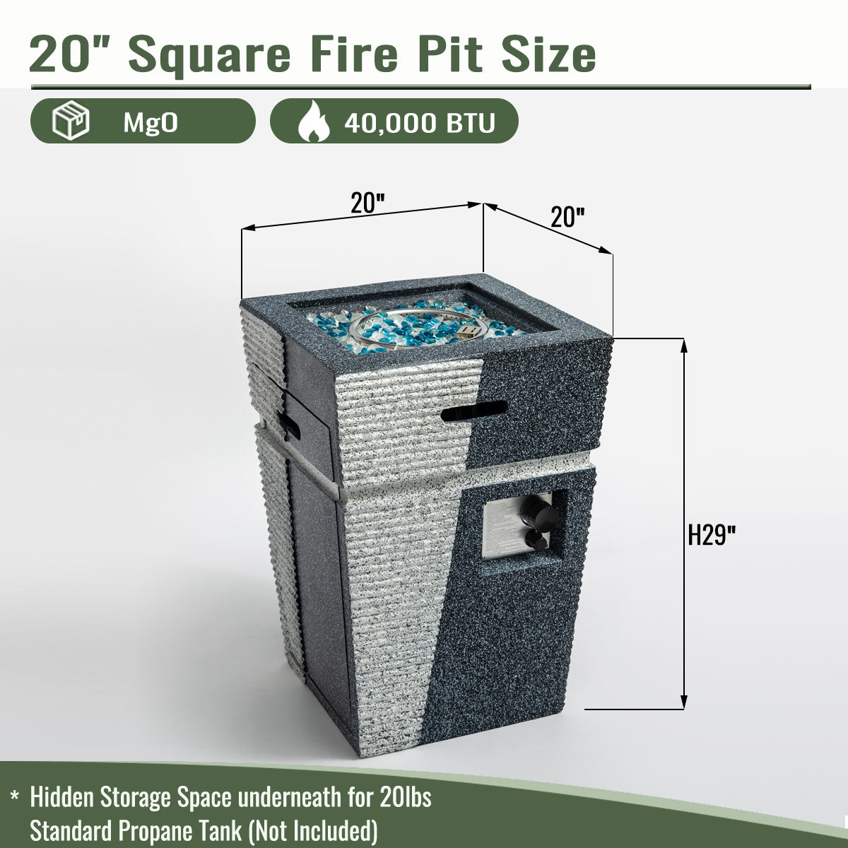 20" Propane Gas Fire Pit Table, 40000 BTU Square Concrete Fire Pit for Outside Patio Deck Garden Backyard-Light Gray