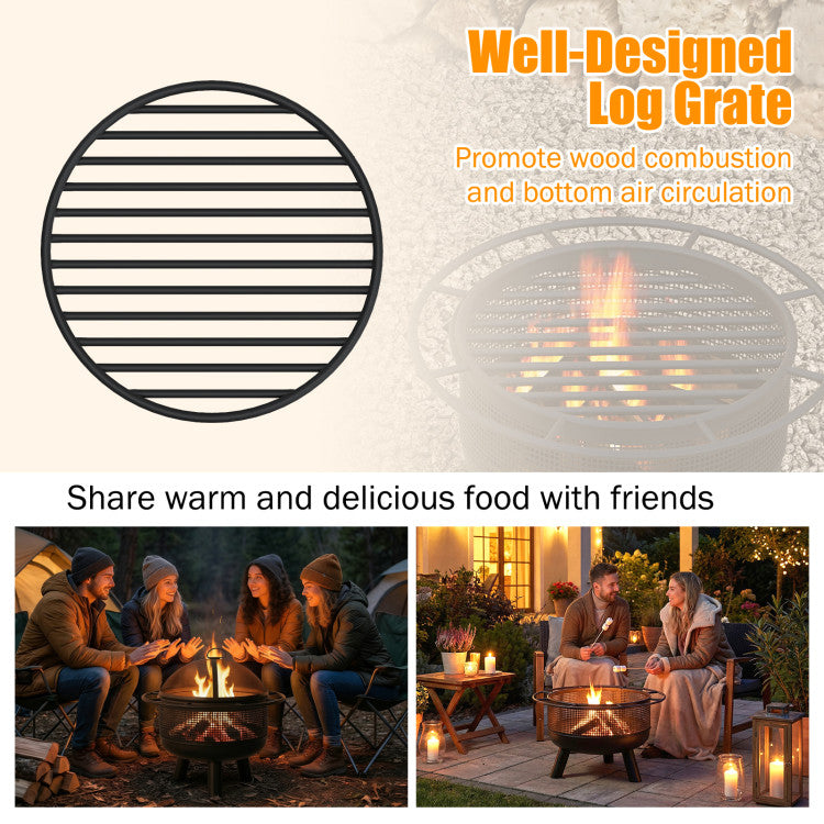 Enhanced Ventilated Design: The round firepit features a log grate and mesh design to improve airflow, ensuring a consistent and robust fire. Meanwhile, this intelligent construction not only boosts the fire's efficiency but also minimizes smoke.