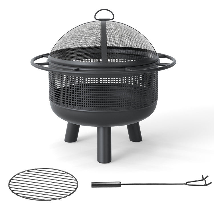 24 Inch Wood Burning Fire Pit with Log Grate and Mesh Screen for Outside