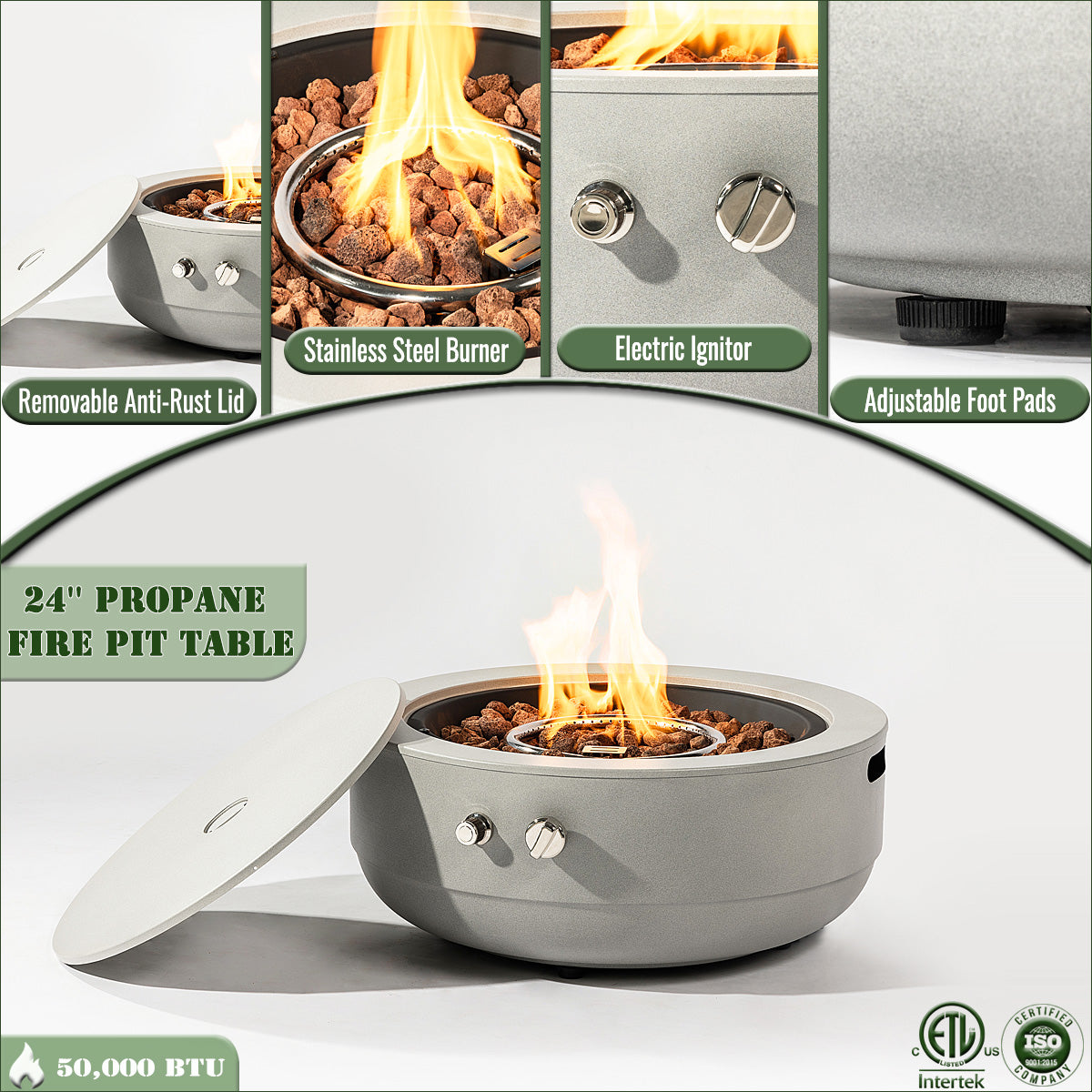 24" Propane Gas Fire Pit Bowl, 50000 BTU Round Steel Fire Pit for Outside Patio Deck Garden Backyard- Grey