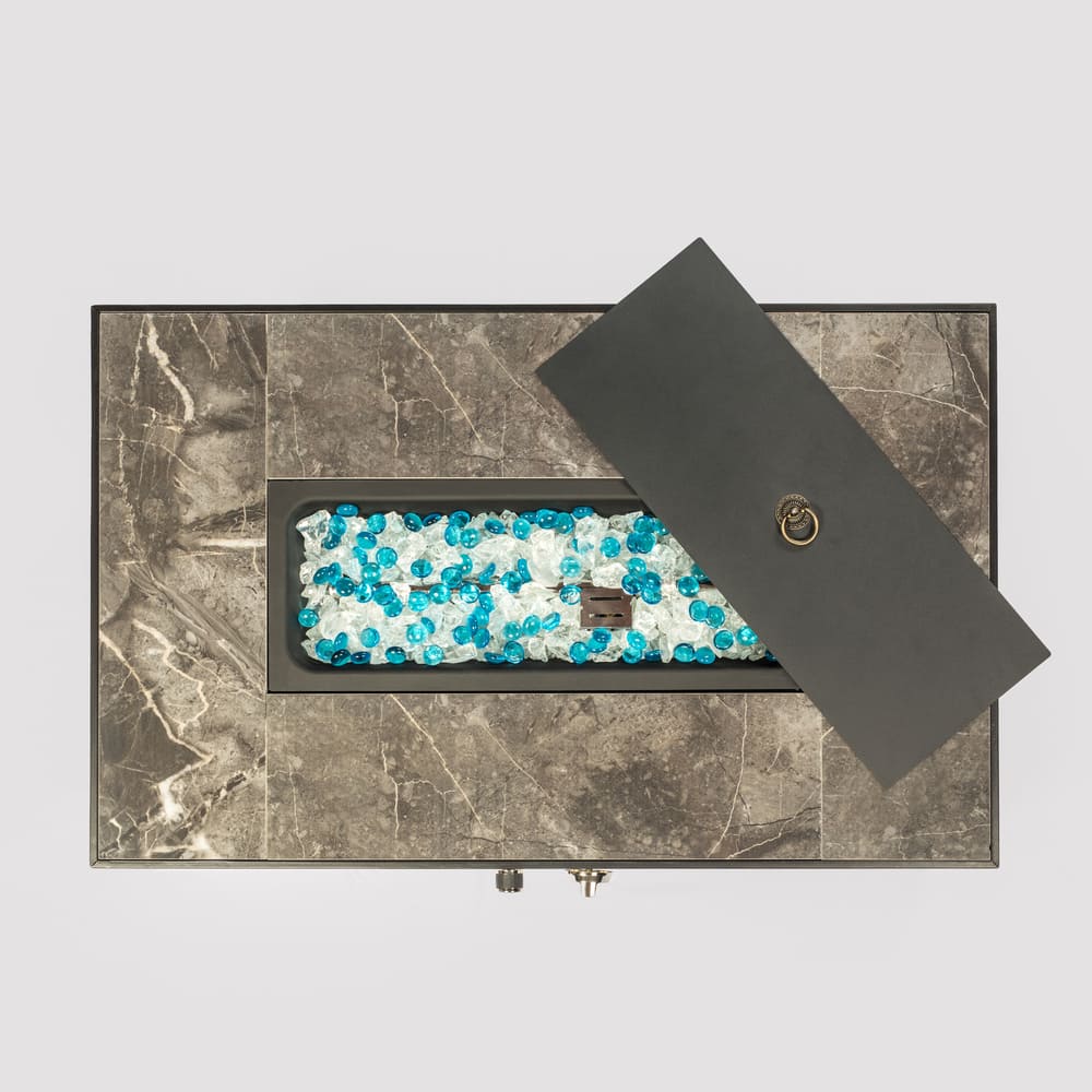 The fire pit is filled with blue and white glass beads. Lit by the flame, they shine brightly, adding a dreamy look and a romantic, warm vibe. They also retain heat well, distributing warmth evenly for a better heating experience.