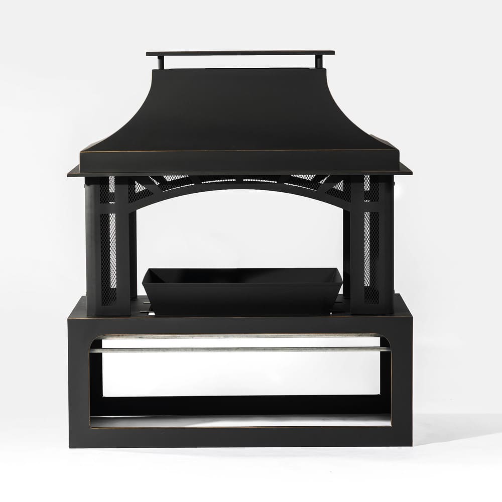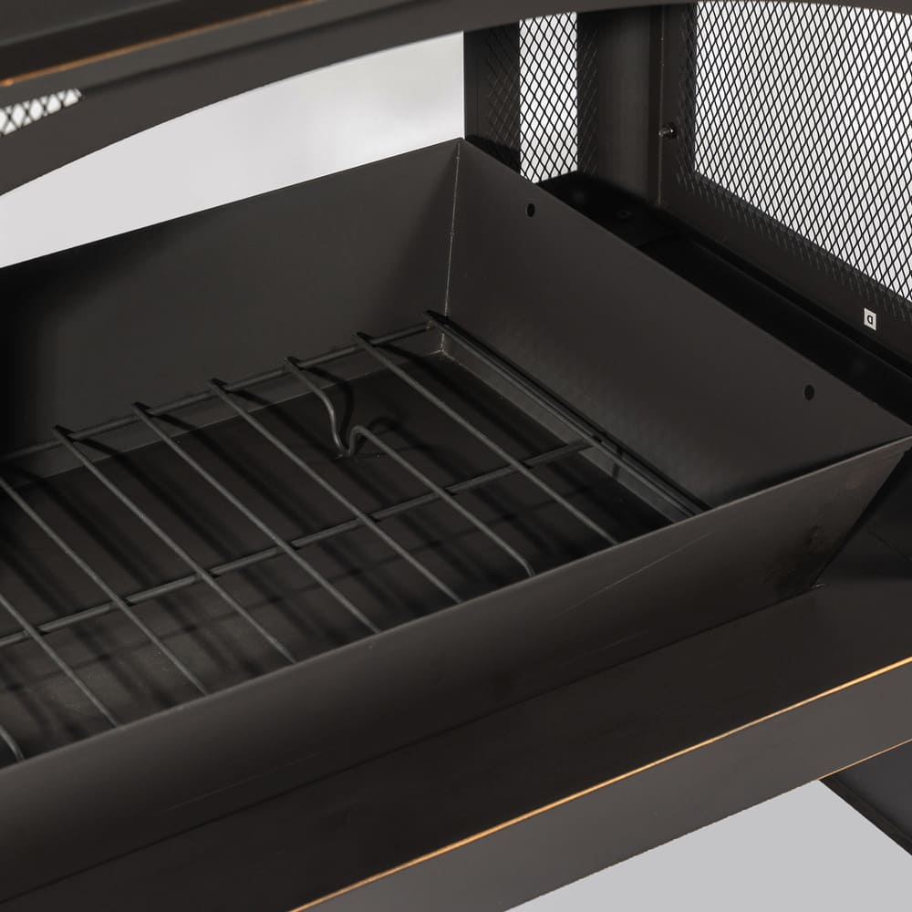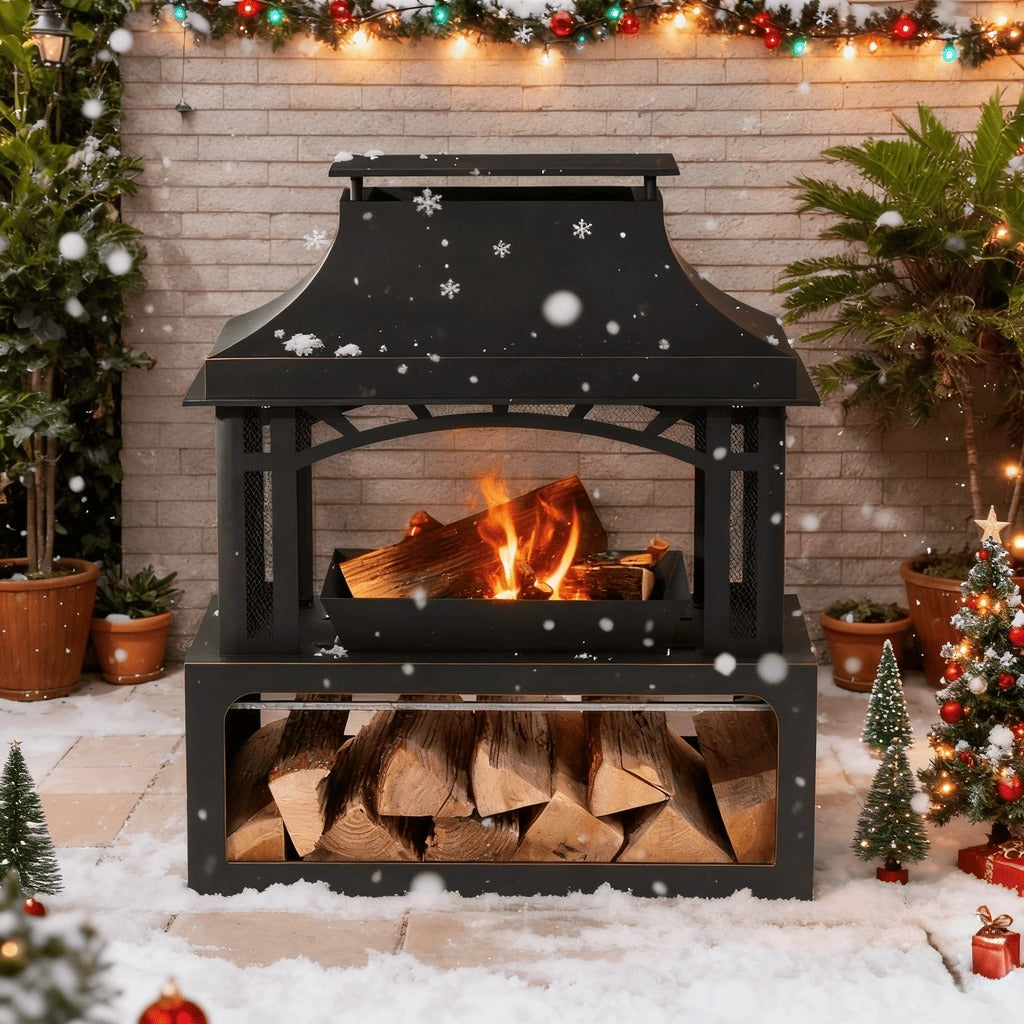 • Thoughtful and Secure Design: The fire pit’s unique spire, reminiscent of a towering chimney, is expertly designed to efficiently channel smoke and ash, minimizing their presence in your gathering space. The integrated metal spark screen acts as a reliable shield, preventing embers from escaping, while the built-in wood storage underneath adds a quaint, rustic touch to the overall design.