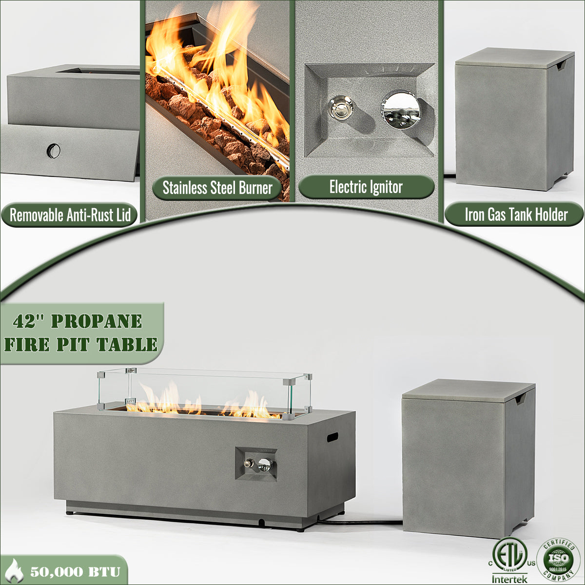 42" Propane Gas Fire Pit Table 2-Pieces, 50000 BTU Rectangular Steel Fire Pit with Glass Wind Guard for Outside Patio Deck Garden Courtyard -Light Gray