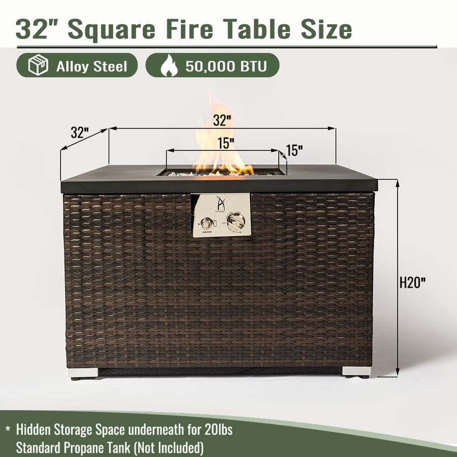 Outdoor Gas Fire Pit Square Dark Brown Wicker Fire Pit Table Propane Fire Table with Glass Rocks