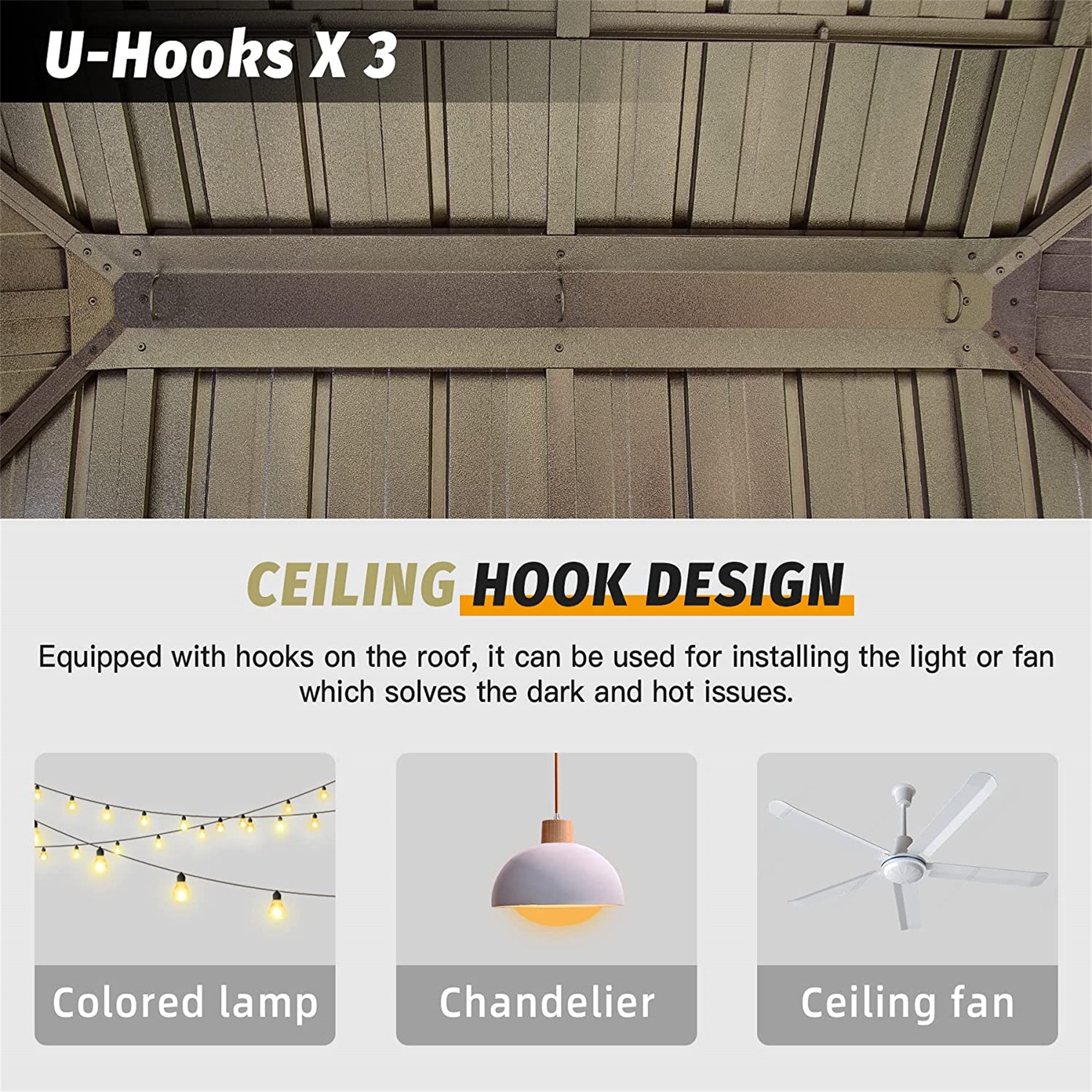 • 【VENTED DOUBLE HARDTOP】Compared with one layer design, this double gazebo canopy allows sunlight to filter though and provides excellent airflow. Galvanized steel metal top can withstand heavy snow, which provide you a privacy, safe and cool room.