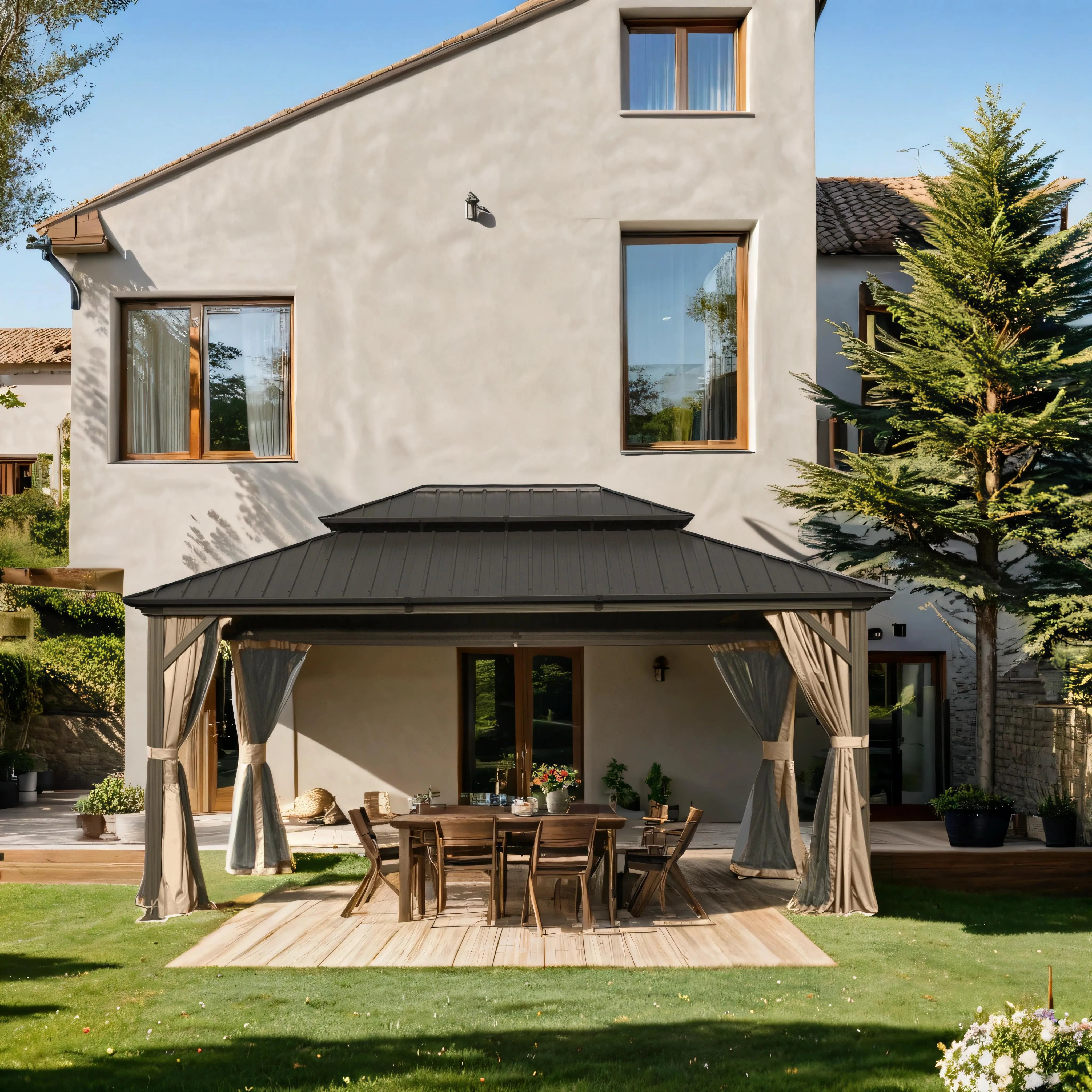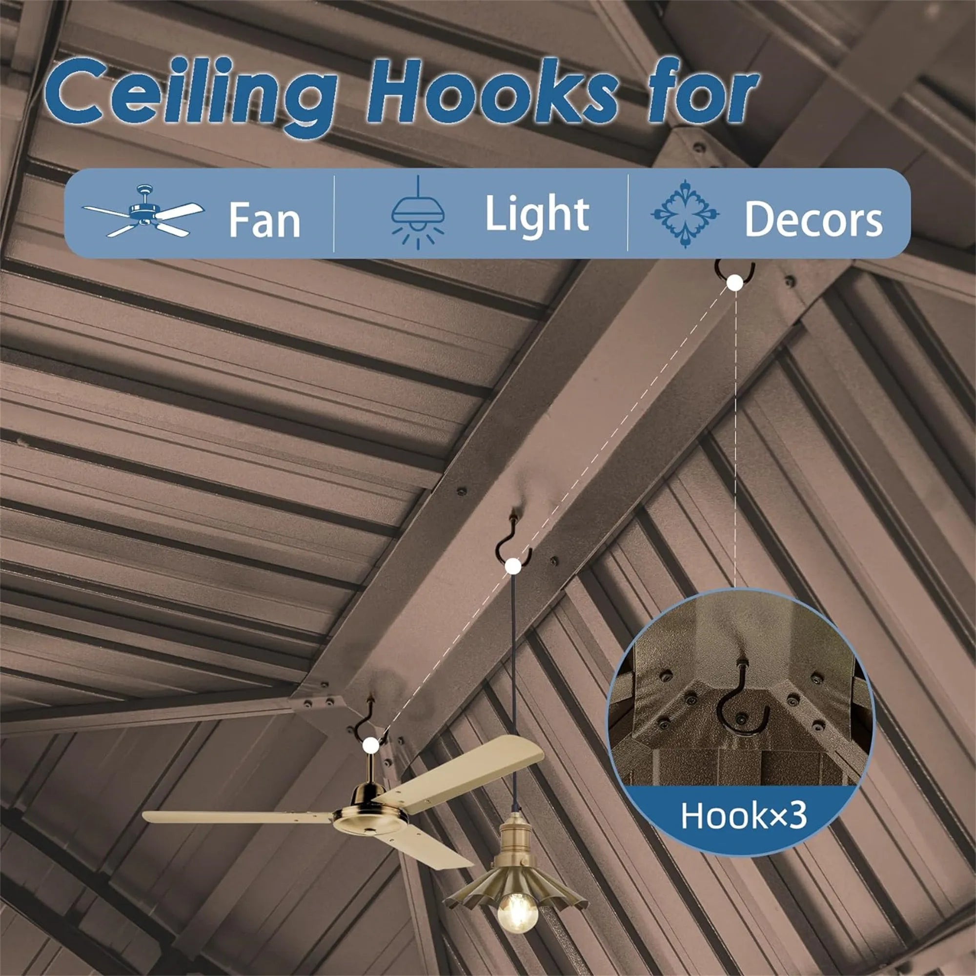 We are introducing the Mondawe 10x14FT hardtop double roof outdoor gazebo, where outdoor living meets ultimate comfort. Crafted with premium aluminum and galvanized steel, it withstands nature's elements while maintaining elegance. Dual roof design ensures year-round enjoyment. Effortlessly hang lights or decorations with strong hooks. Complete with curtains and netting for privacy and insect-free relaxation. Versatile for entertaining, dining, or even as an outdoor office. Easy assembly with included hardware. Elevate your outdoor oasis with a timeless yet modern style.