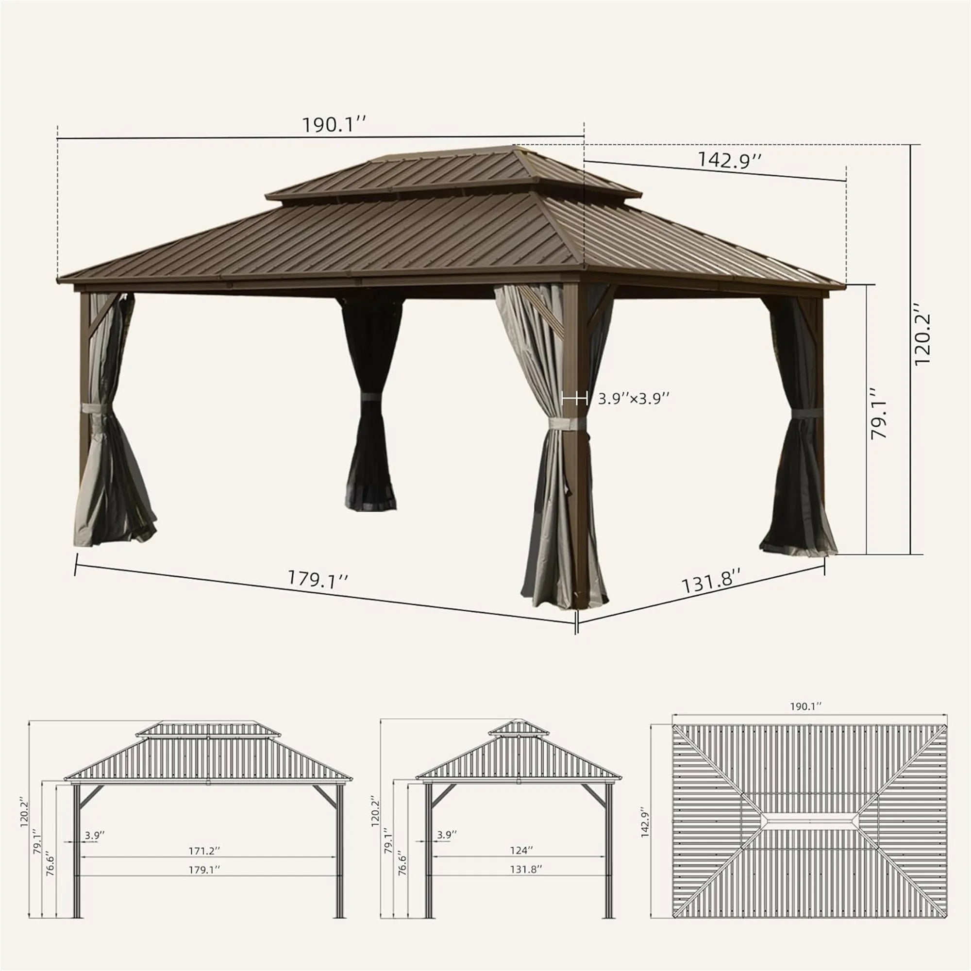 • Discover durable outdoor luxury with our 12x16 Outdoor Hardtop Gazebo. Aluminum build, galvanized steel roof, and bonus curtains and netting create a perfect backyard haven for all seasons. Enjoy easy setup and robust hooks for decor.