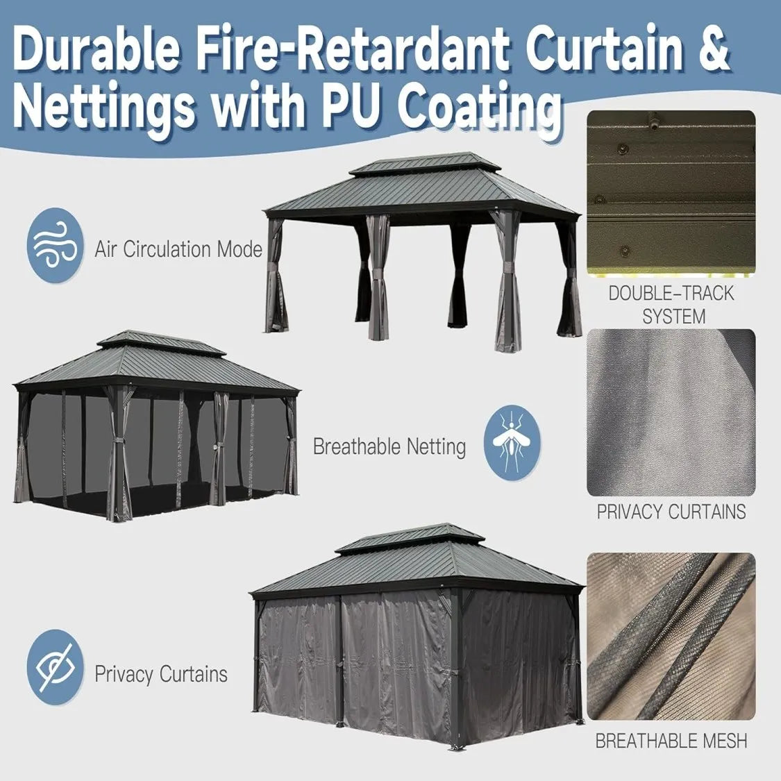 • Privacy and Protection- The removable curtains and netting provide additional privacy and protection from UV rays, serving as a barrier against mosquitoes and other insects.