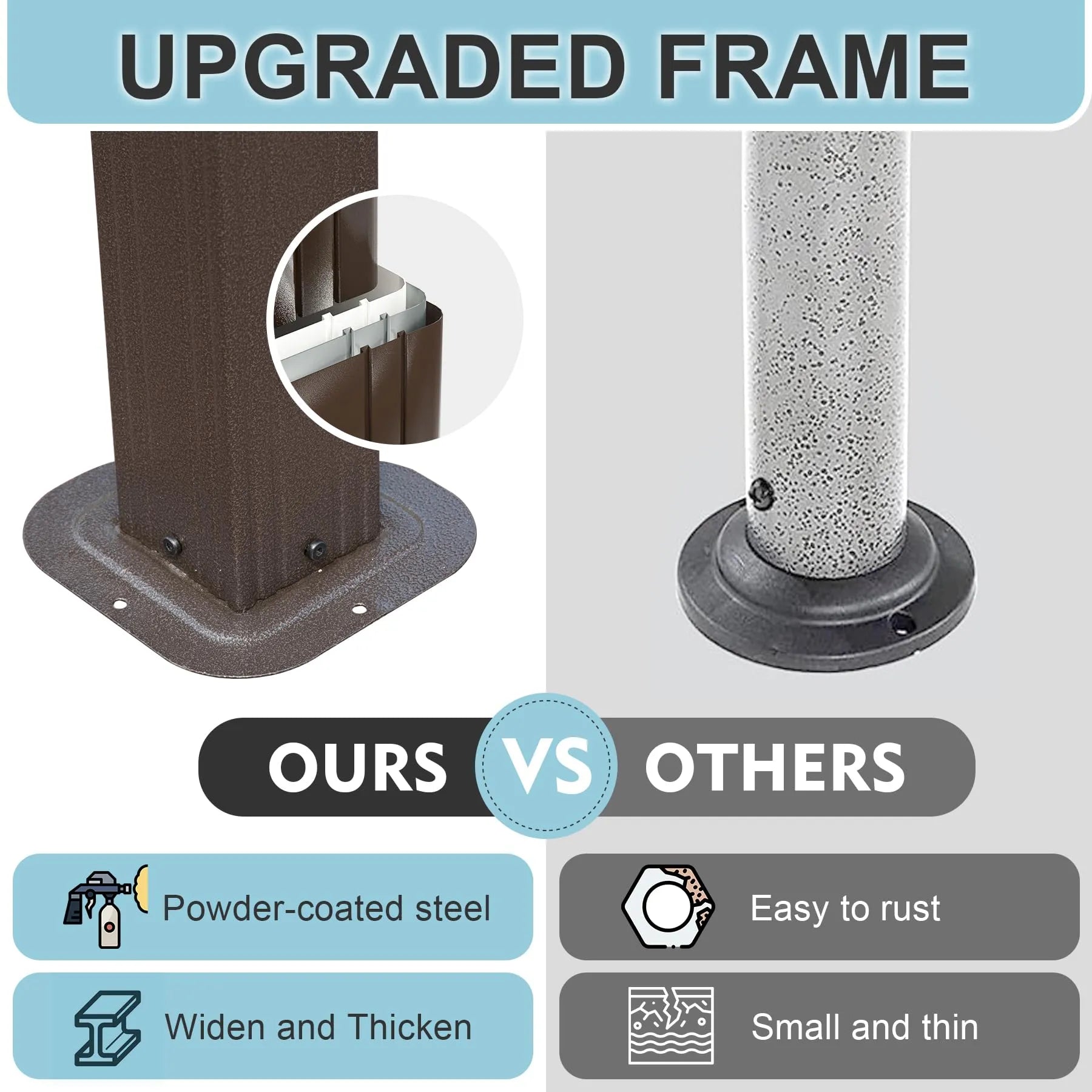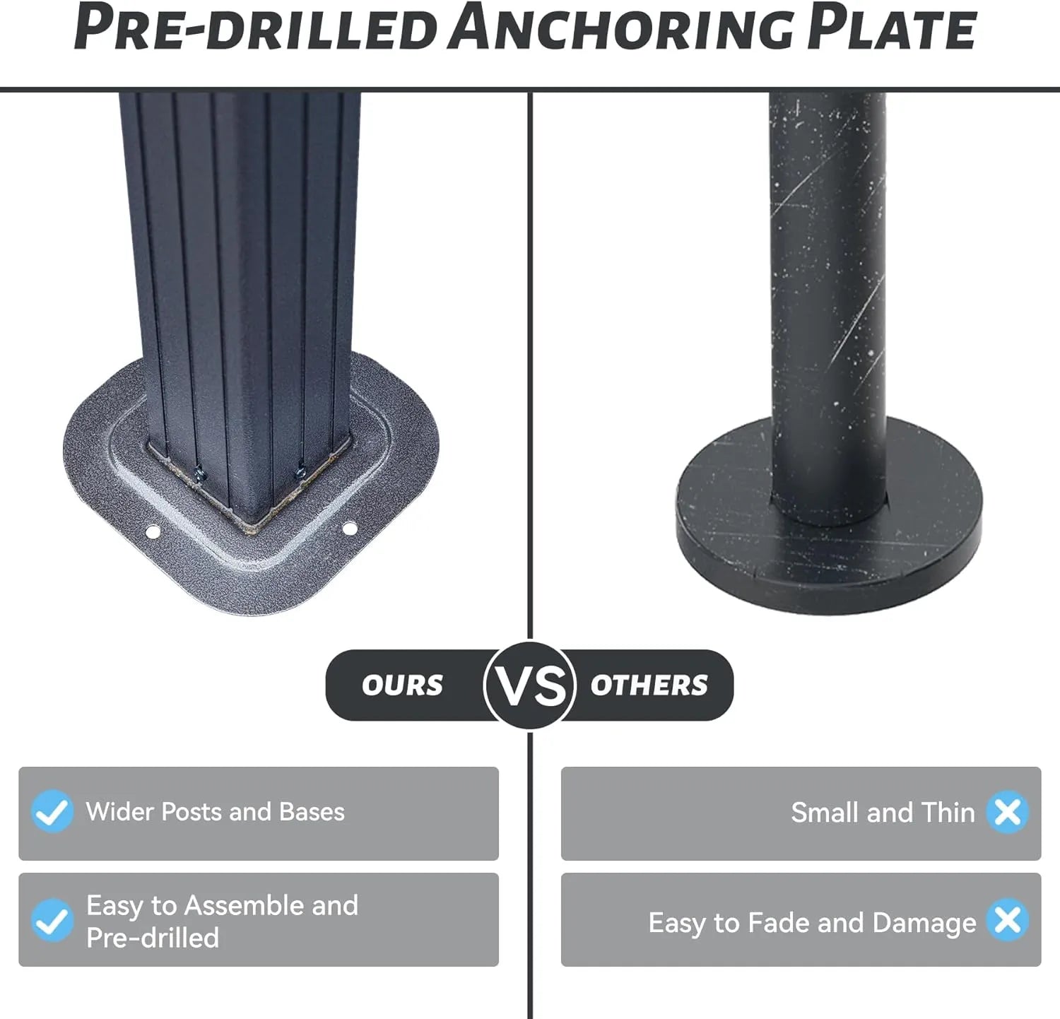 • Sturdy Metal Frame- This hardtop gazebo is supported by a robust all-steel frame, reinforced with triangular braces for maximum stability and strength. With pre-drilled bases for secure anchoring on solid surfaces like concrete, ensuring reliability in windy or rainy conditions.