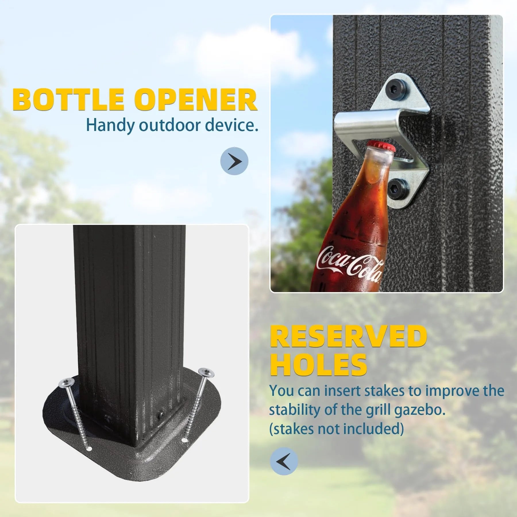• Convenient Side Shelves- The bbq gazebo comes with two built-in side shelves, offering ample space for food and drink preparation. These shelves help keep your grilling essentials organized and within reach, making your outdoor cooking experience more efficient and enjoyable.