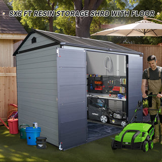 8 x 6 ft Resin Outdoor Storage Shed Waterproof Shed with Floor & Two Windows & Lockable Door, Tool Shed for Garden, Patio, Backyard,Grey/Black/White+Gray/Brown
