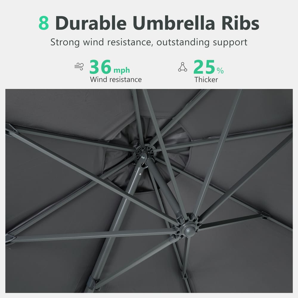 • Stable & Durable: Our cantilever umbrella has a strong aluminum pole and 8 iron ribs, with a patented design for quality. Resistant to rust and very sturdy, it pairs well with a heavy-duty rotating base (not included) for stability.