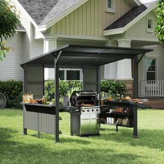 9x10FT Grill Gazebo Hardtop, Metal BBQ Gazebo with Storage Shelves and Expansion Platform, Heavy Duty Grill Canopy with Sloped Roof for Patio