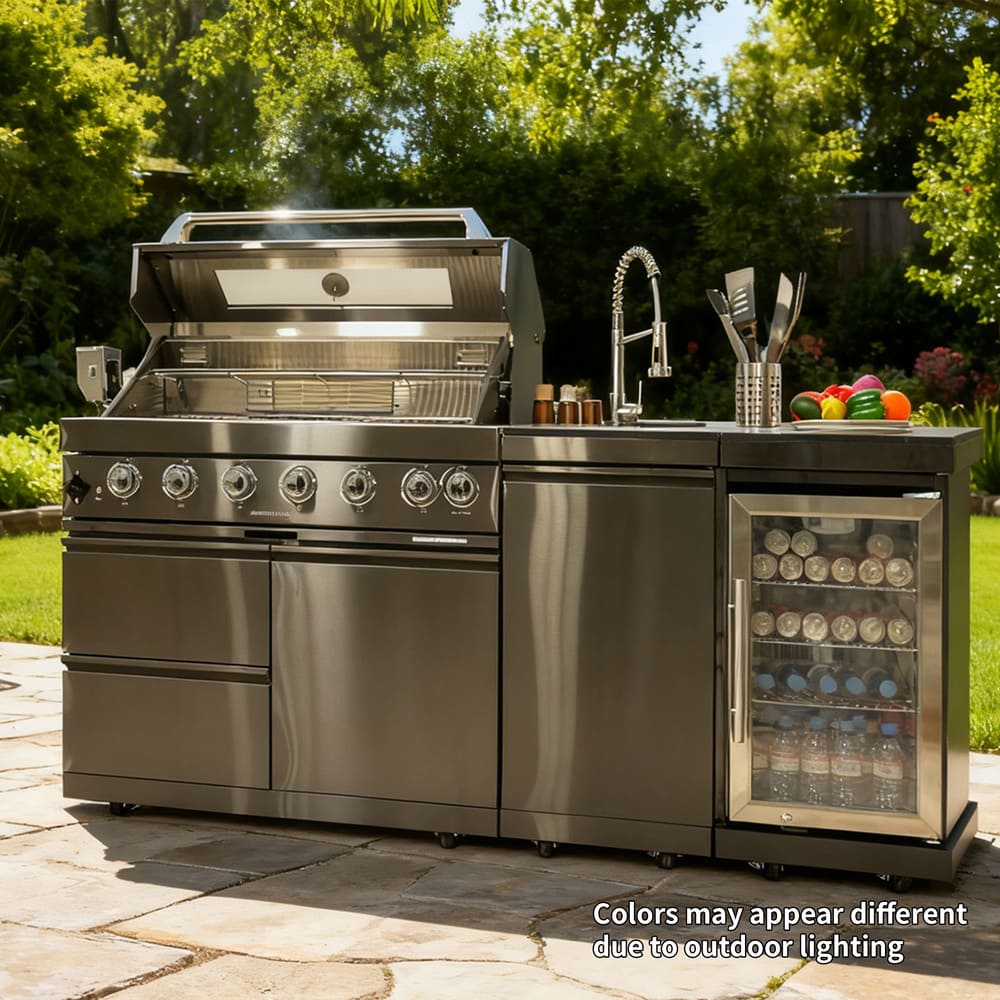 • STAINLESS STEEL CONSTRUCTION - This modular outdoor kitchen is made of 304 marine grade stainless steel, a high-quality material that is known for its durability & resistance to corrosion & rust that also adds sleek, modern, and stylish addition to your backyard or patio. High consistent heat output are made possible by the stainless steel burners, allowing you to cook a variety of food and meals with ease. The stainless steel components also make the grill easy to clean and maintain.