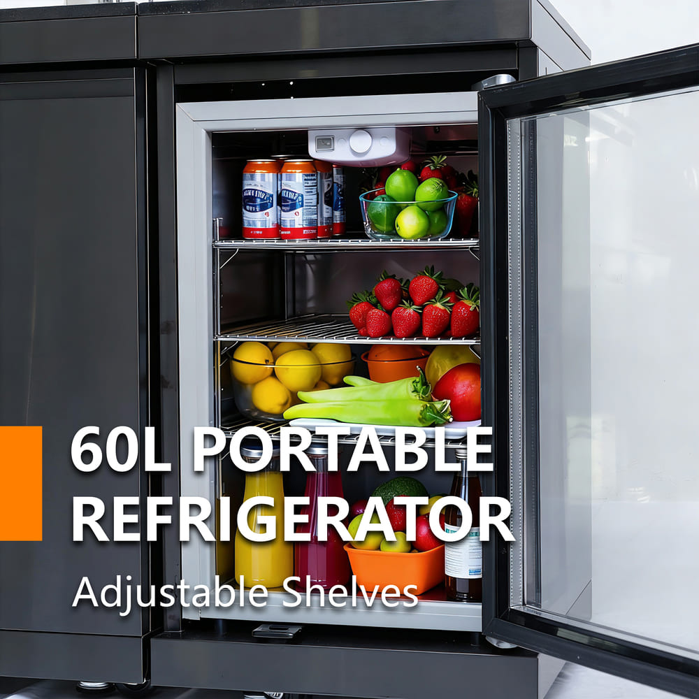 • REFRIGERATOR FEATURES - The outdoor rated ONRUN refrigerator is made with heavy duty 304 stainless steel construction for durability and resistance to the elements. It comes with a stylish glass door for easy viewing of contents and interior blue lighting as well to improve visibility and overall user experience. Additional features include temperature control, adjustable shelves, and a lockable door to secure contents and prevent unauthorized access. Dimensions - 18 1/2” x 18” x 26 1/2”