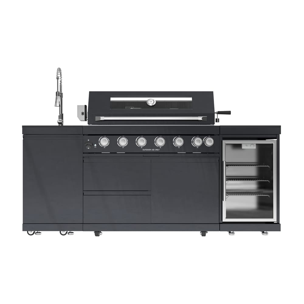 43-Inch 6-Burner 85000 BTU Deluxe Stainless Steel Gas Outdoor Kitchen Bar Barbecue Island Grill + Wine Cooler Compact Refrigerator + Rotisserie kit + Granite Countertops + Stainless steel Sink