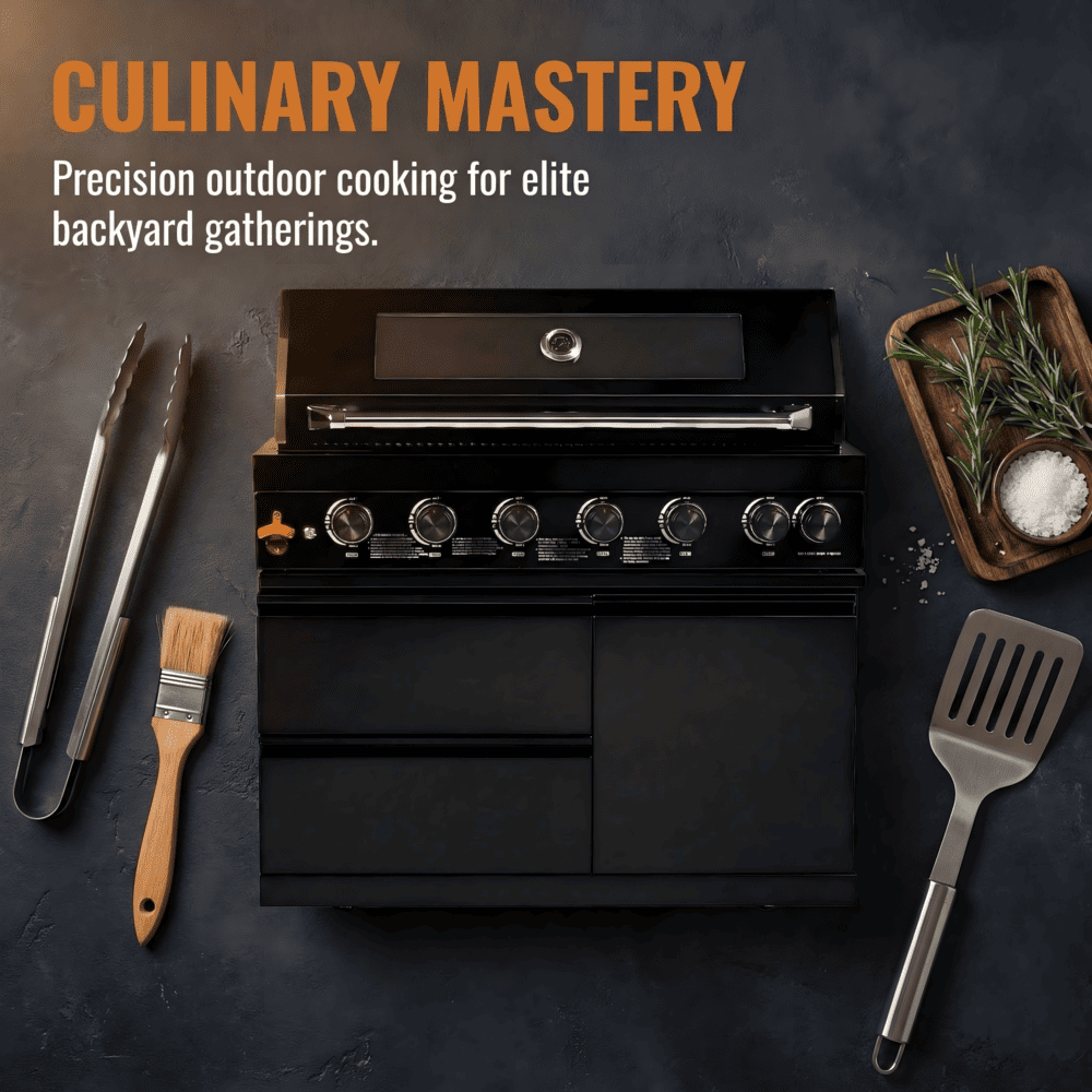 • A double lined grill hood with temperature gauge is standard for maximum heat retention. The grill has two cooking surface halogen lights, On/off red/white changing control knob lights, a bottle opener, electronic ignition, easy access full front pull-out grease tray for easy cleaning, black galaxy granite countertops, plus storage drawers and cabinets. Your outdoor kitchen will also come with gliding castor wheels for smooth and easy-to-maneuver movement and increased stability
