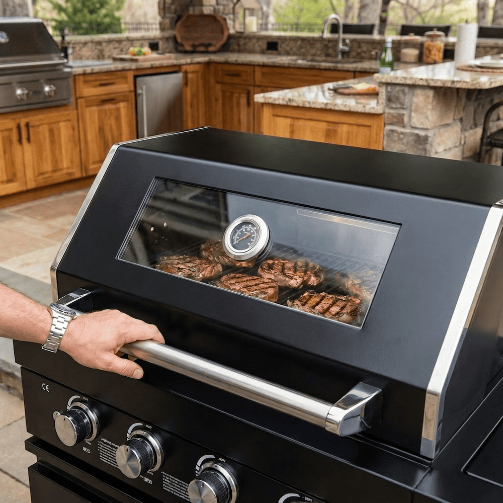 • ADDITIONAL FEATURES - A double lined grill hood with temperature gauge is standard for maximum heat retention. The grill has two cooking surface halogen lights, On/off red/white changing control knob lights, a bottle opener, electronic ignition, easy access full front pull-out grease tray for easy cleaning, black granite countertops, plus storage drawers and cabinets. Your outdoor kitchen will also come with gliding castor wheels for smooth and easy-to-maneuver movement and increased stability.
