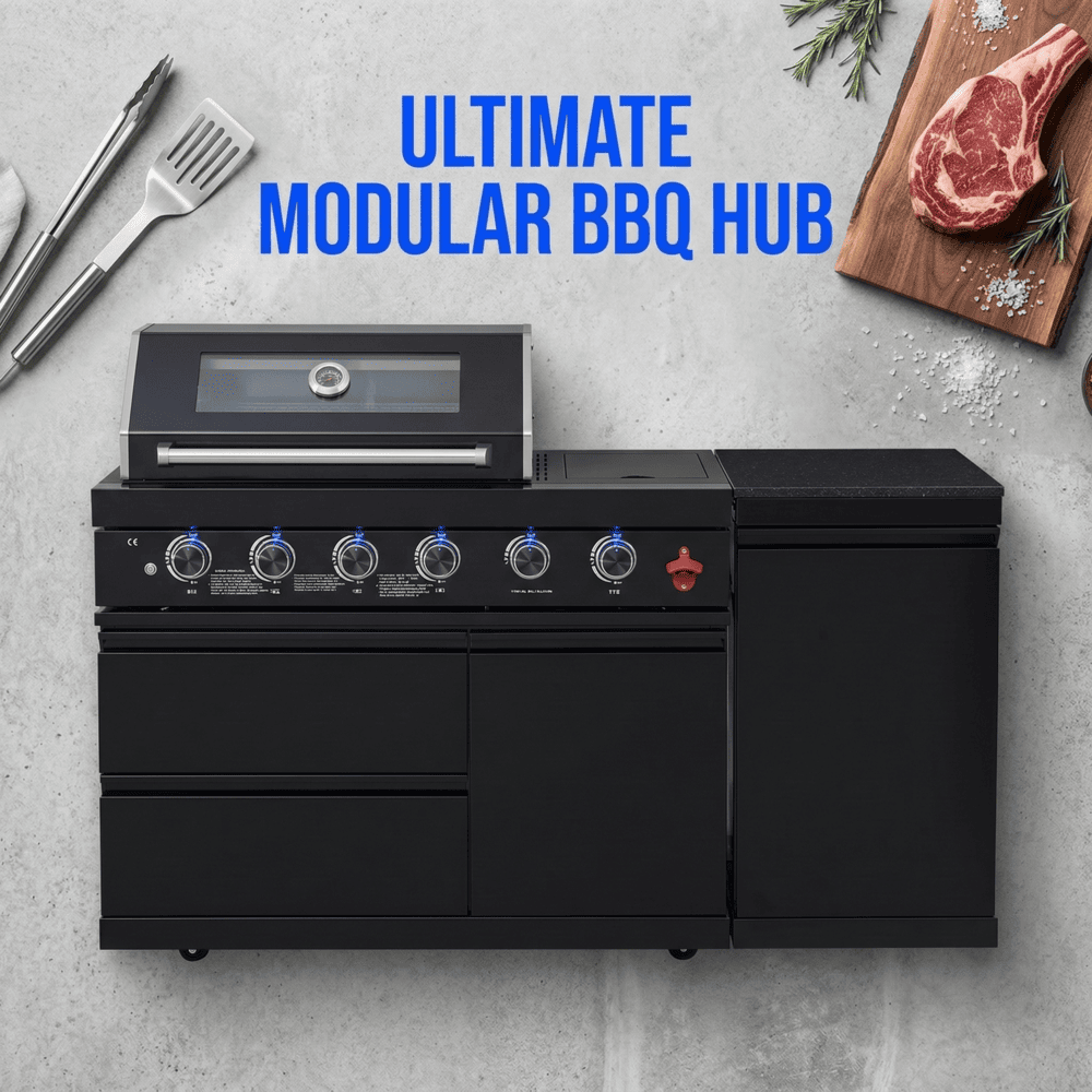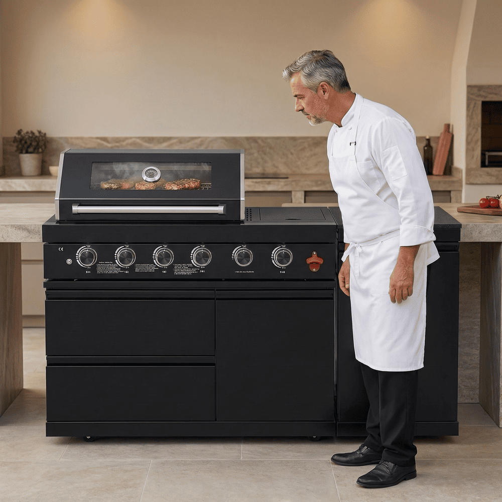• ADDITIONAL FEATURES - A double lined grill hood with temperature gauge is standard for maximum heat retention. The grill has two cooking surface halogen lights, On/off red/white changing control knob lights, a bottle opener, electronic ignition, easy access full front pull-out grease tray for easy cleaning, black granite countertops, plus storage drawers and cabinets. Your outdoor kitchen will also come with gliding castor wheels for smooth and easy-to-maneuver movement and increased stability.