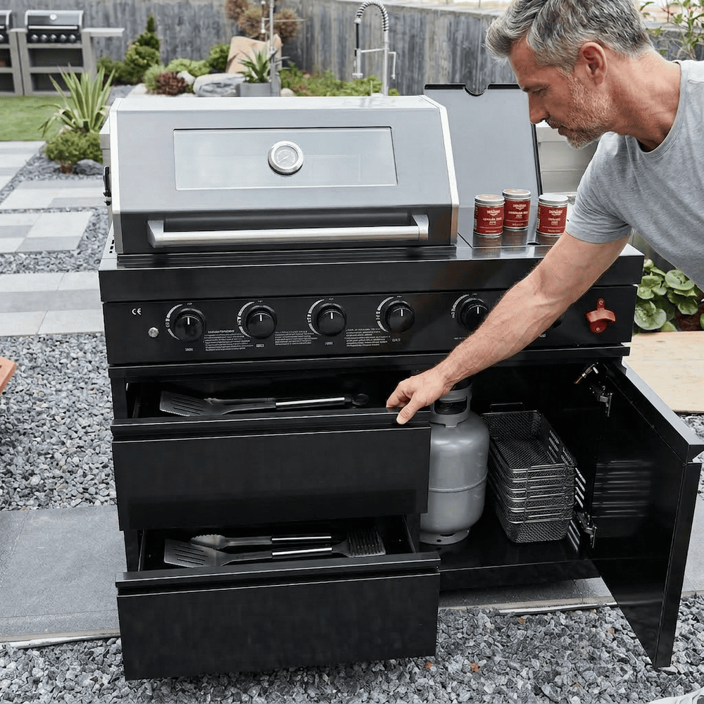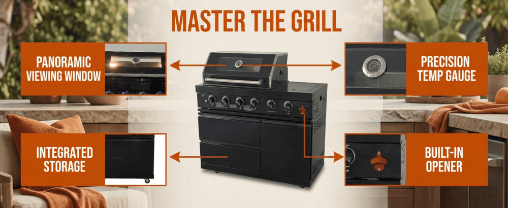 • Integrated Modular Design for a Seamless Look: Engineered to standard outdoor kitchen dimensions, this grill module is designed to integrate perfectly with companion cabinetry, side burners, and accessories. Its unified black stainless steel aesthetic and precise fit create a cohesive, custom-built appearance, transforming your patio into a fully functional and stylish culinary station.