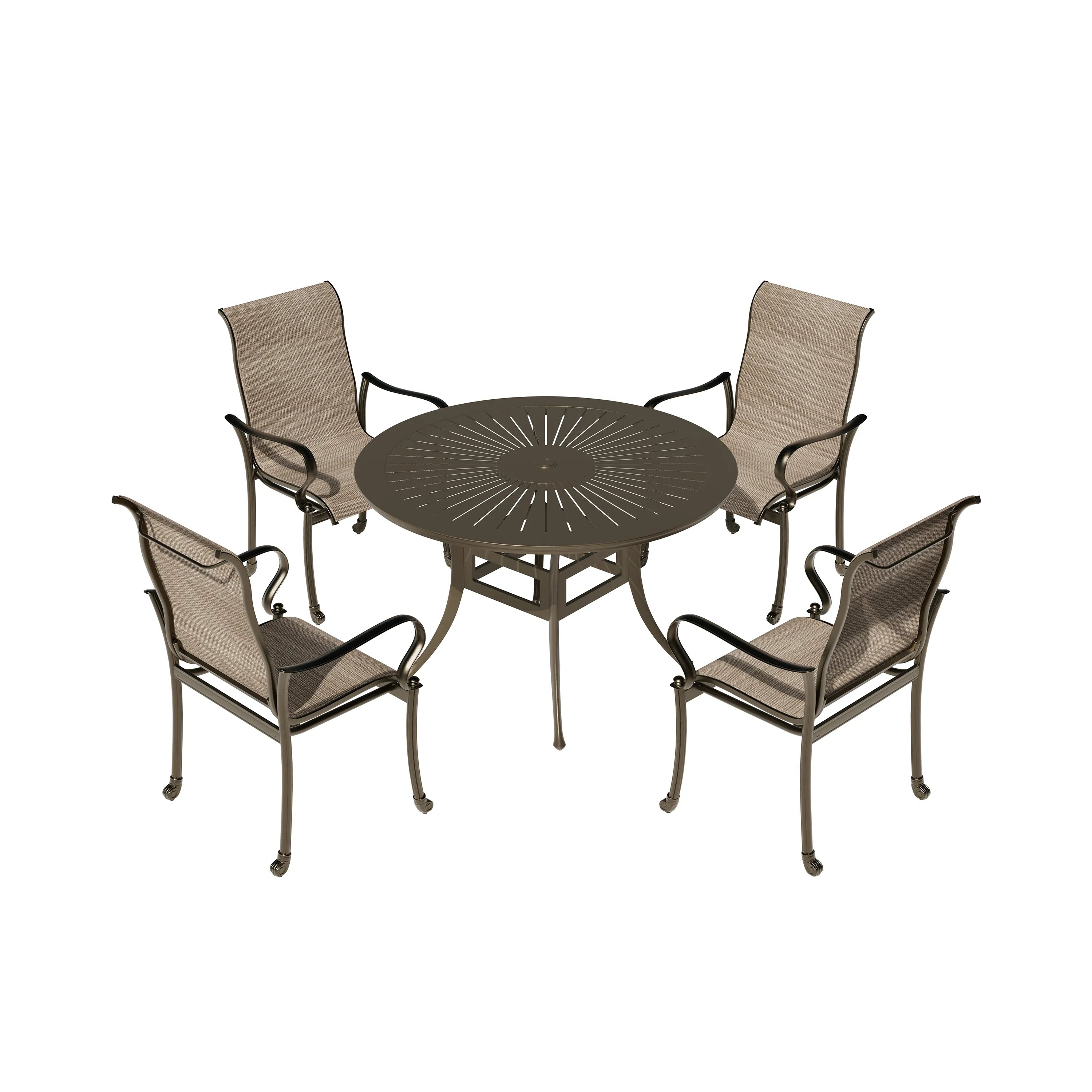 • Dining Set Included: a 48" round aluminum table with 2.1" umbrella hole and 4 textilene chairs with cushion