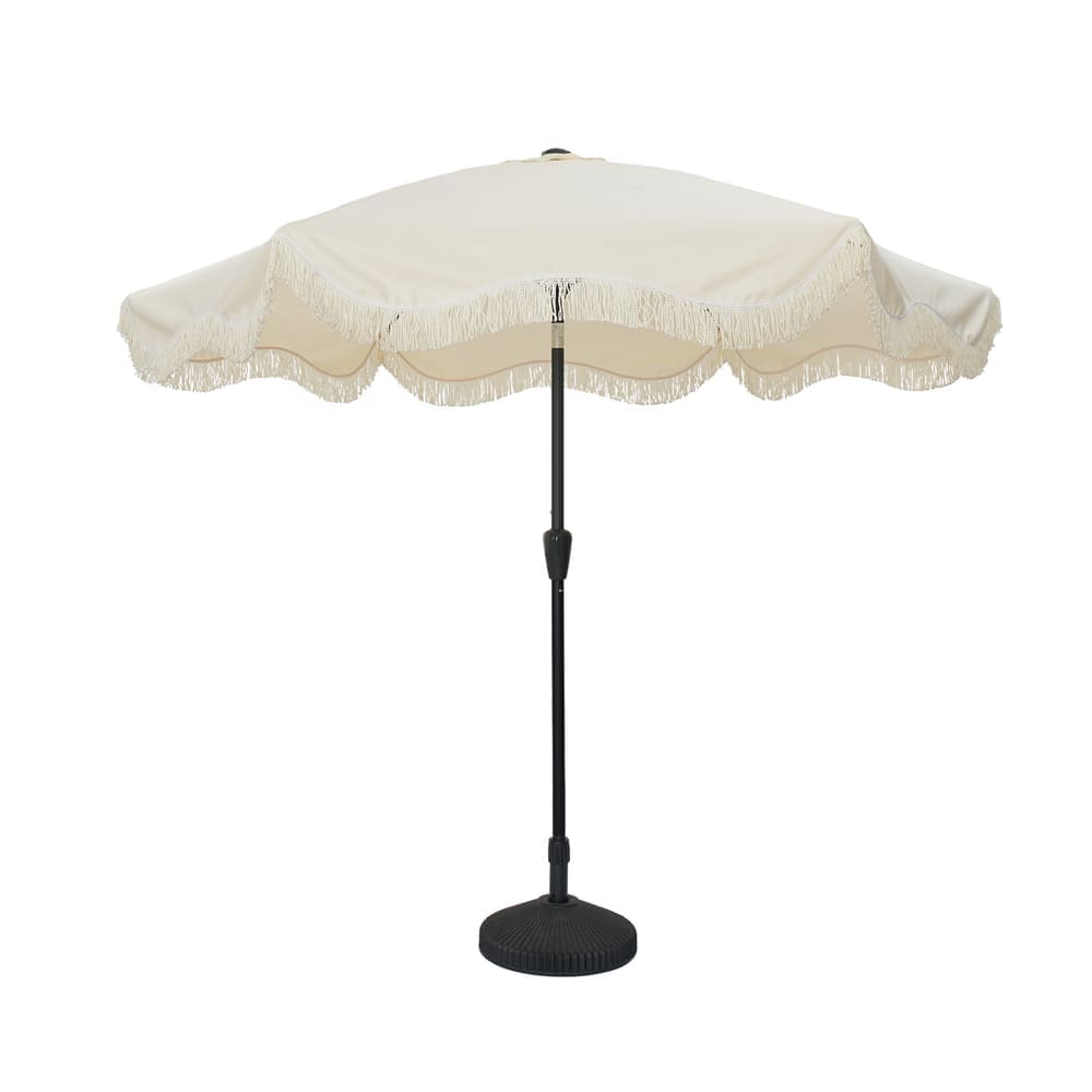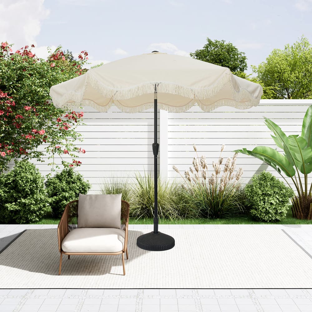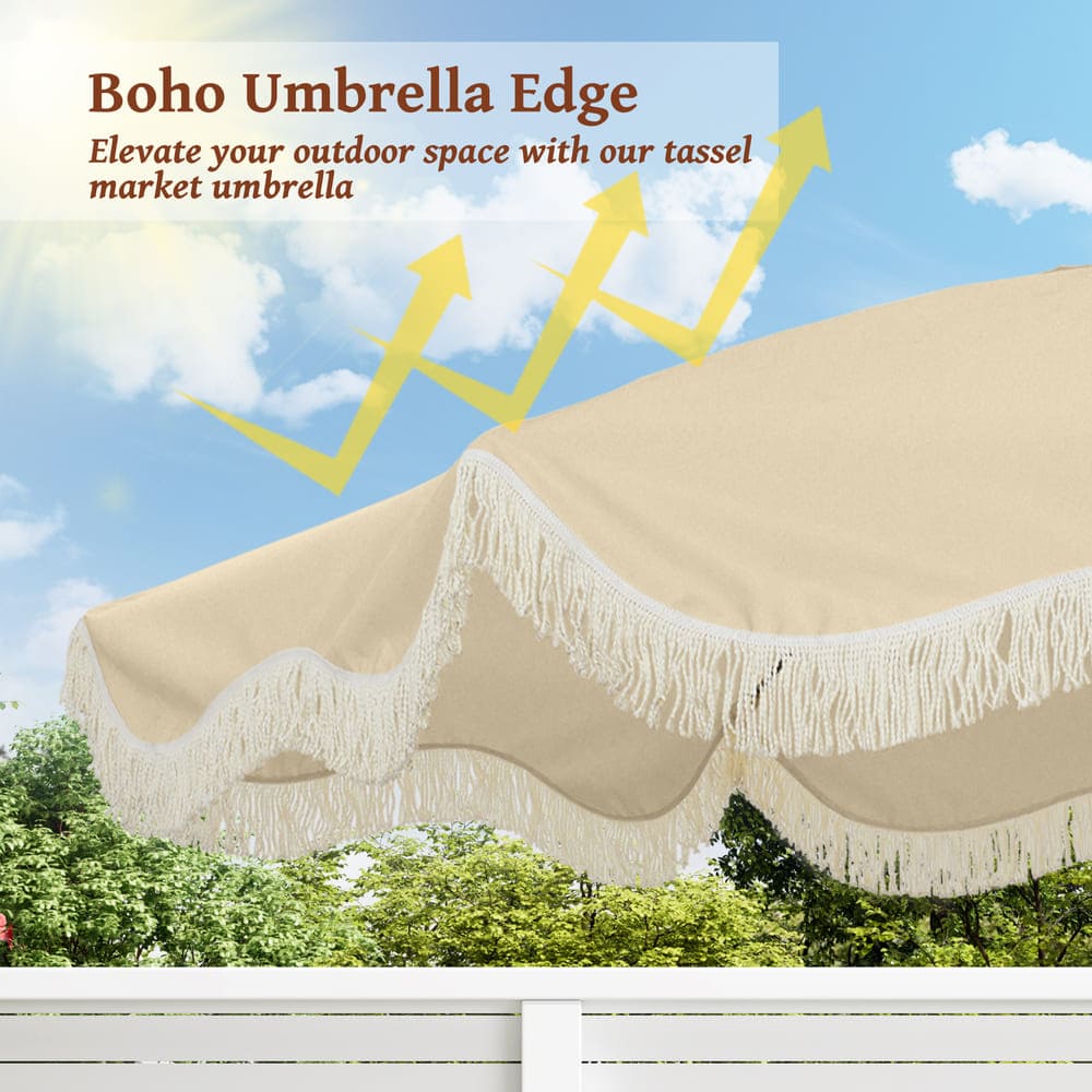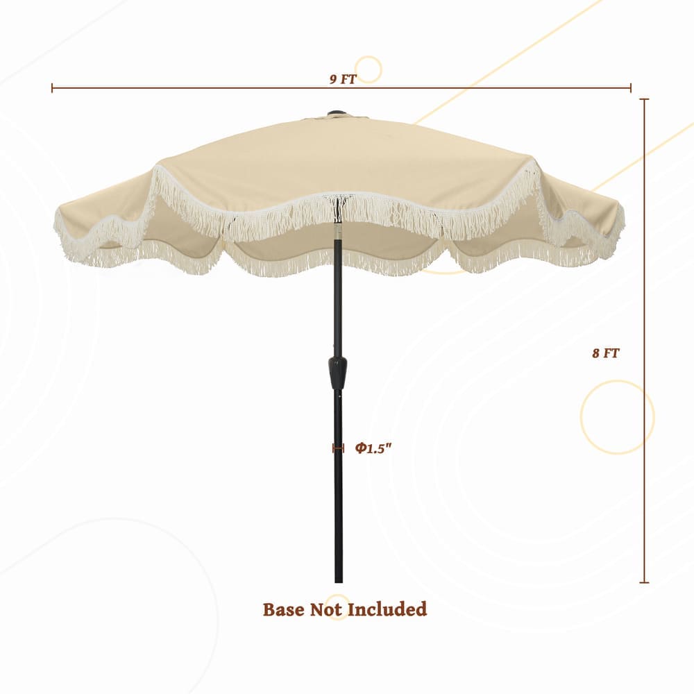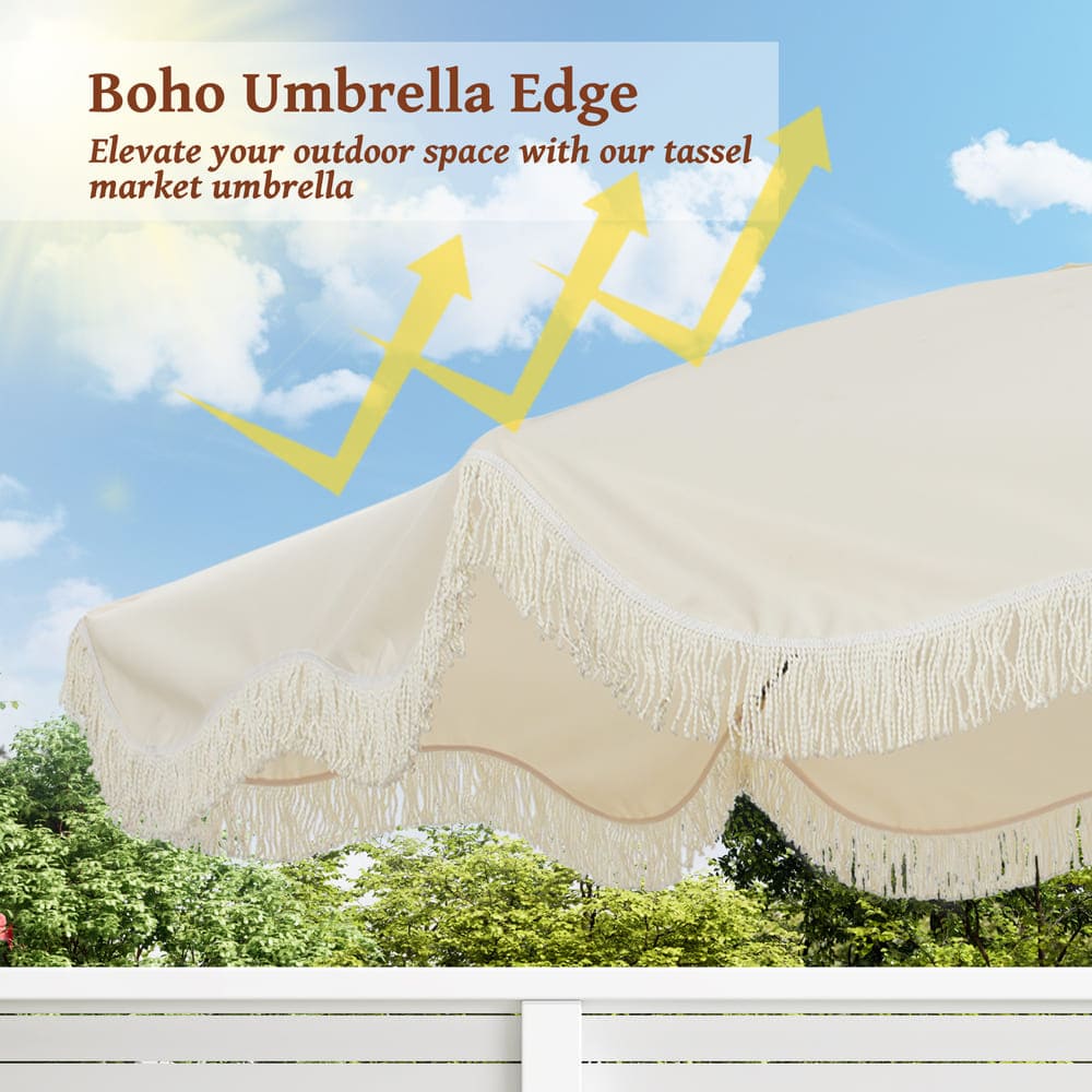 9 FT Tassel Market Patio Umbrella with Full Fiberglass Rib in Cream/Beige/Tan