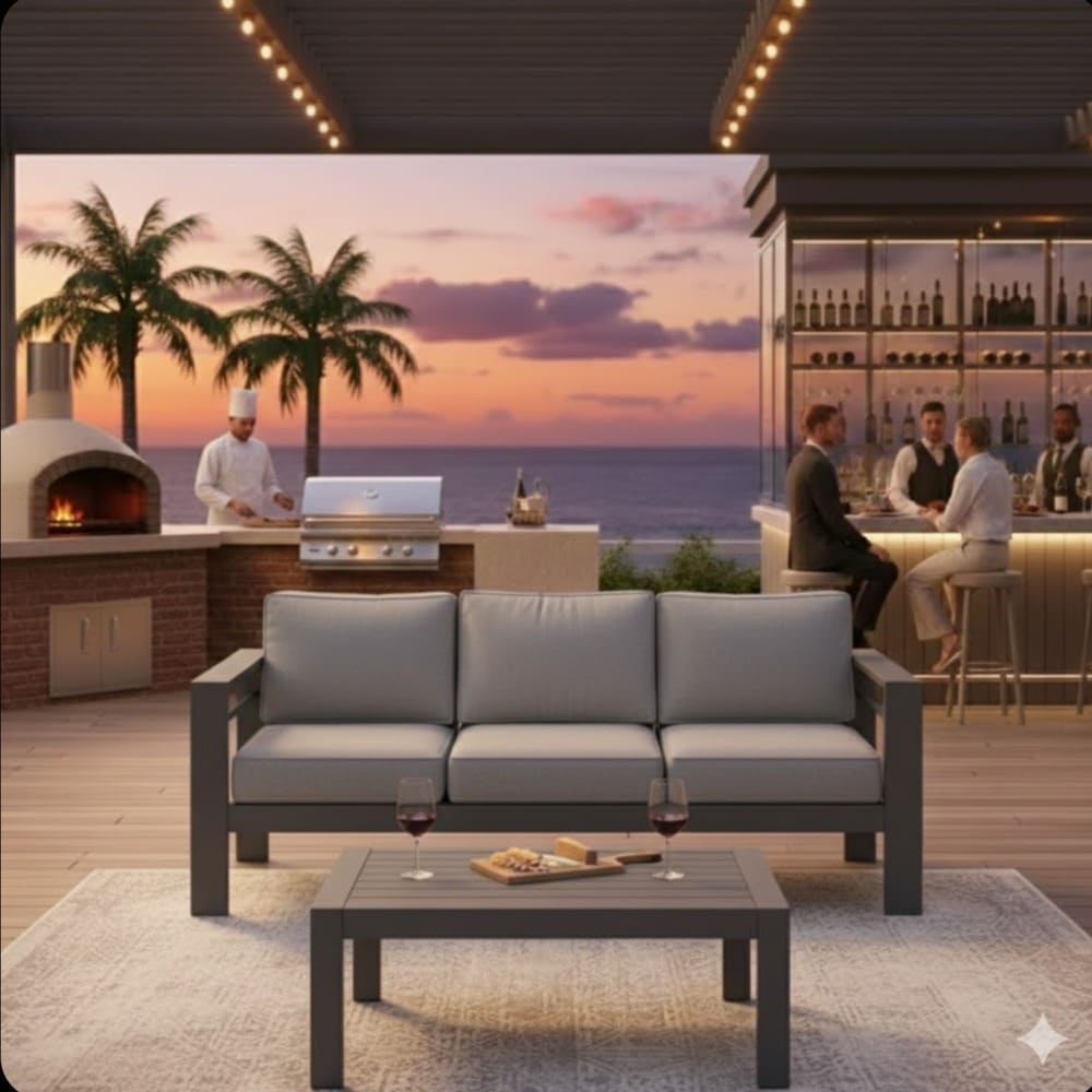 • • Spacious Wood-Like Coffee Table 43" × 24" wood-grain textured top is waterproof, sun-resistant, and easy-clean. Adds rustic elegance with practical durability – perfect for drinks, snacks, or decor while complementing the sofa beautifully.