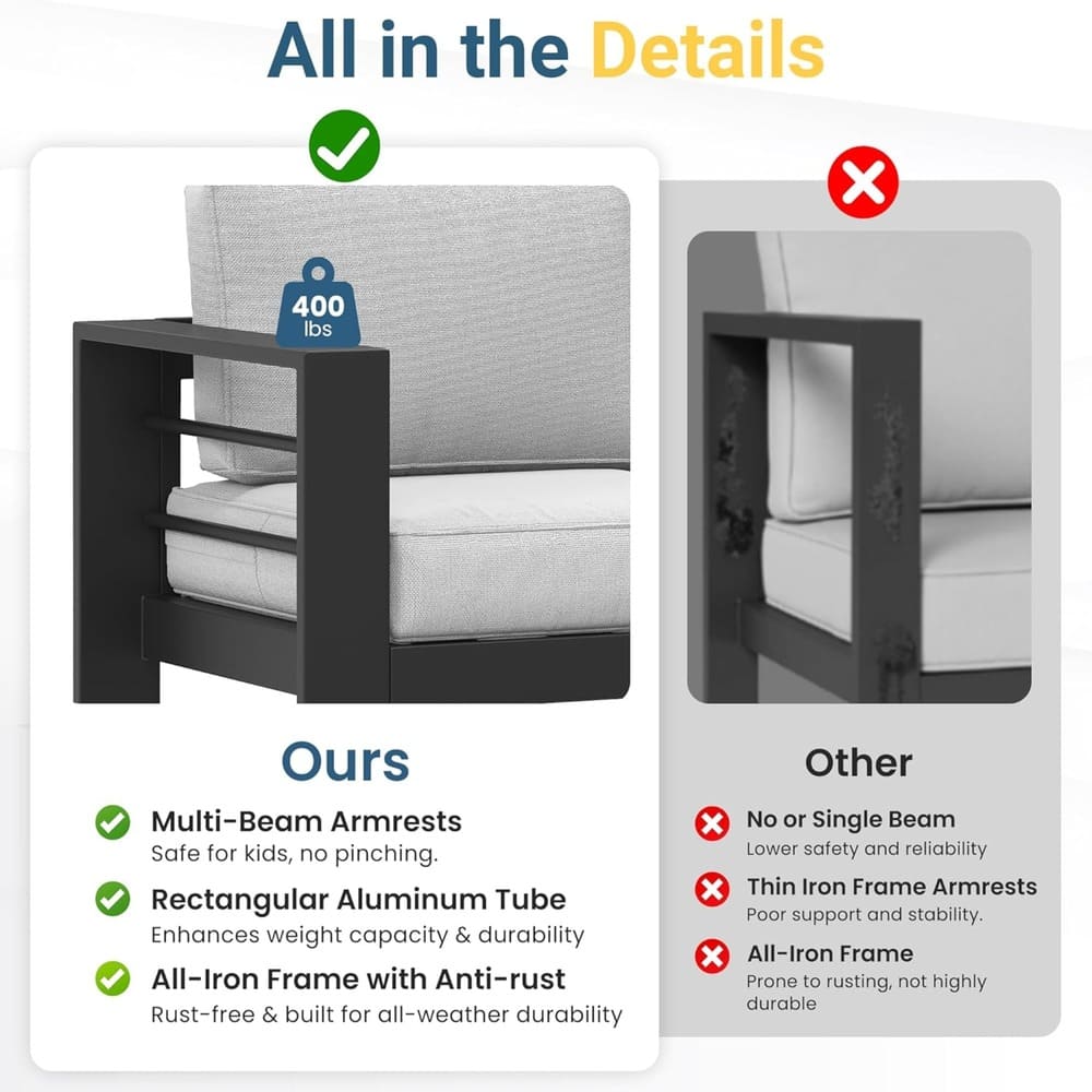 • Built from robust all-iron frames with high-quality protective paint coating, both pieces resist rust, deformation, and harsh weather while delivering rock-solid stability—even in strong winds. The sofa’s wide multi-beam armrests offer enhanced safety and comfort, ideal for families with children or pets.