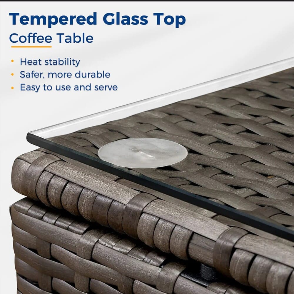 • • Sleek Modern Style & Removable Tempered Glass Tabletop: Clean lines, contemporary blue wicker, and a frameless tempered glass top create an elegant, upscale look. Glass lifts off in seconds for easy cleaning – perfect blend of style and practicality for modern outdoor living spaces.