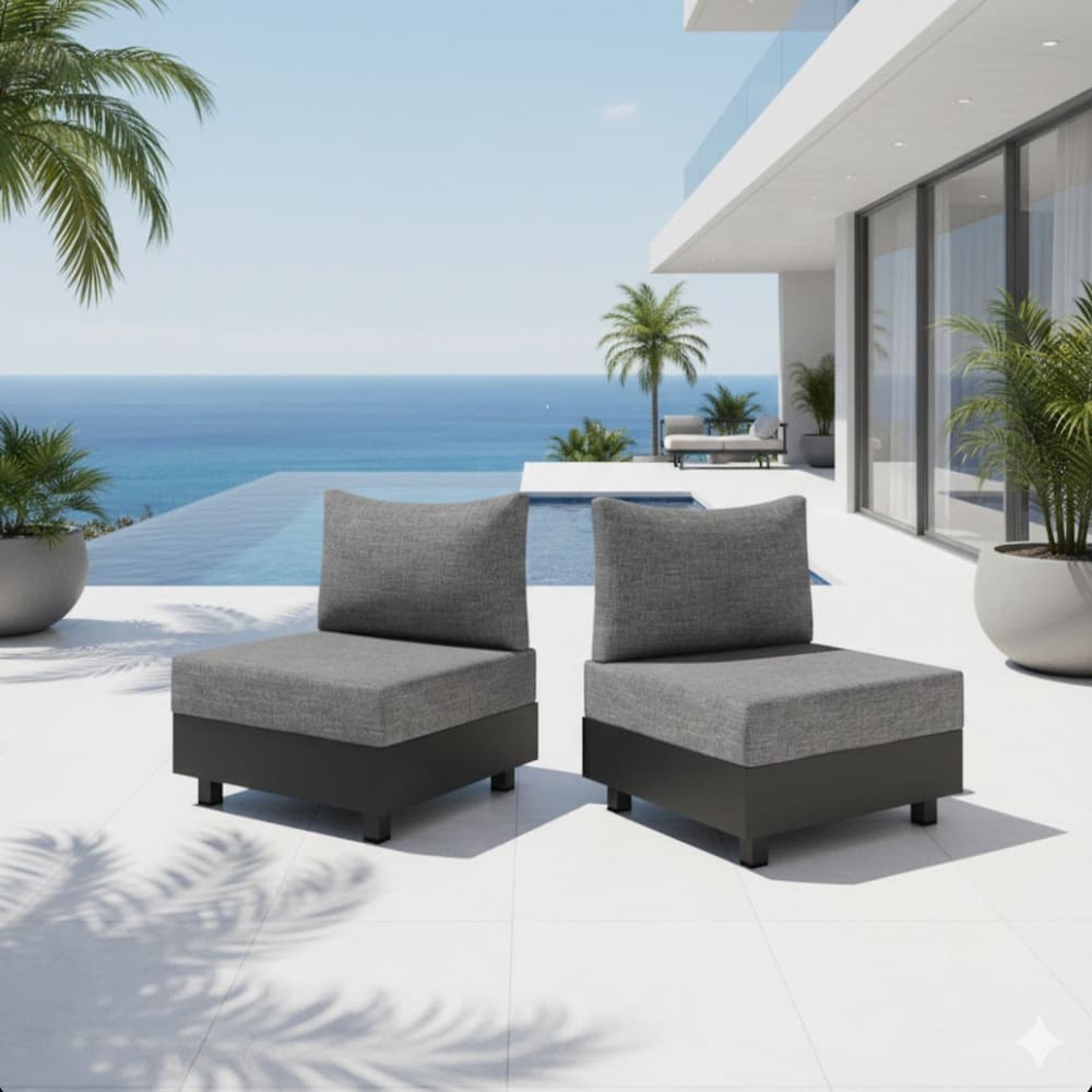 • Transform your outdoor space into a luxurious relaxation zone with this versatile 2-piece all-weather aluminum patio seats in modern gray. Includes Two modular armless chairs and a matching square coffee table – perfect for poolside, gardens, balconies, porches, patios, or courtyards.
