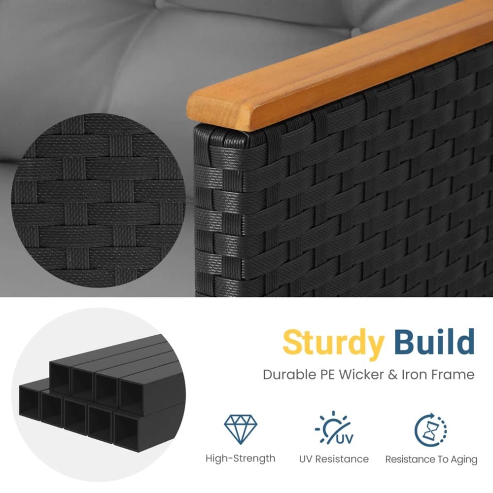 • • Quick Assembly & Low Maintenance: Labeled hardware and step-by-step instructions for easy setup (recommended for 2 adults). Wipe-clean rattan, wood, and removable cushions require minimal effort – enjoy hassle-free outdoor living year-round.