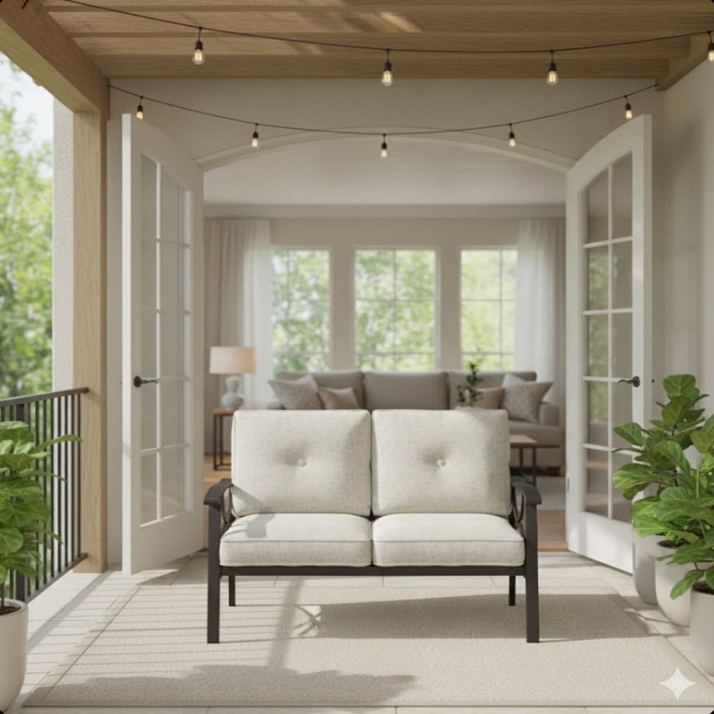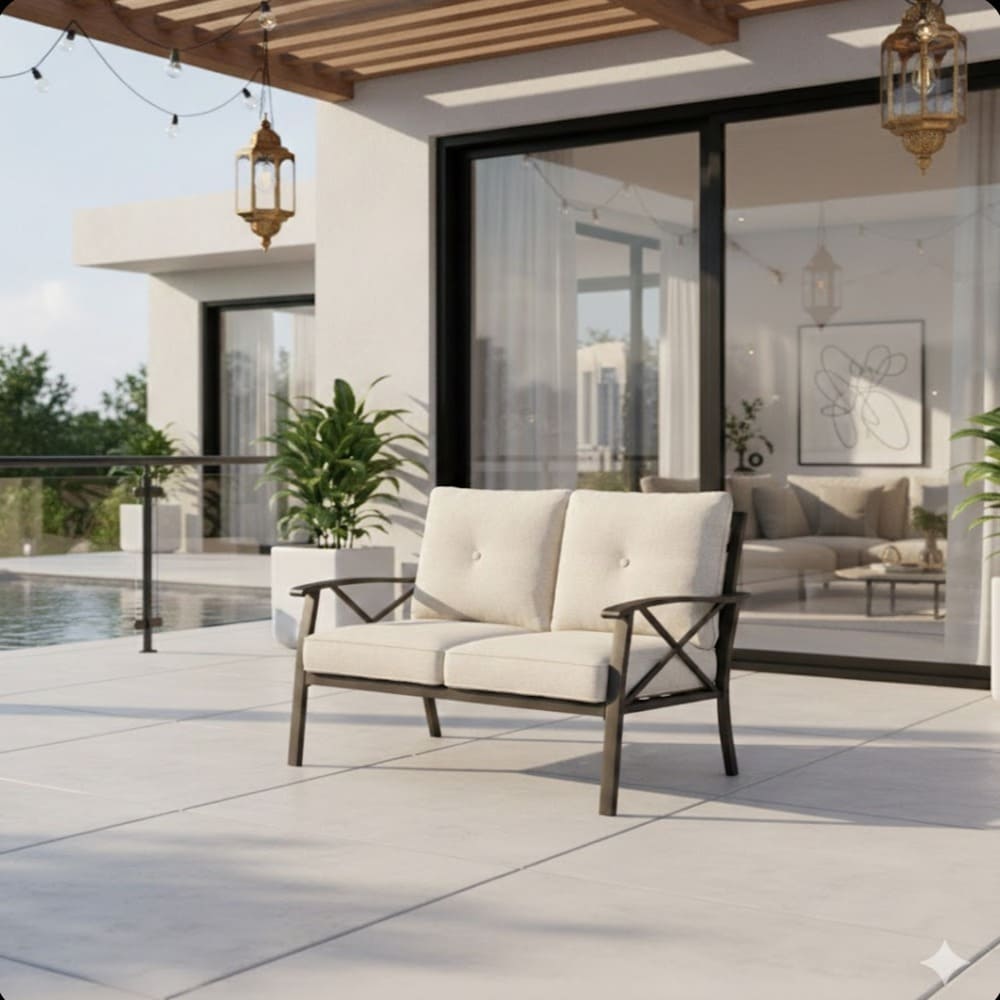 • • Ergonomic Curved Armrest Support Curved armrests provide optimal arm and upper-body support for extended relaxation. Enhances comfort during lounging, conversations, or reading – perfect for unwinding on sunny afternoons or evening gatherings. • Spacious 48" 2-Seat Capacity Generous 48" width comfortably seats two with ample room to relax. Ideal for couples, intimate moments, or solo lounging – combines practicality with luxurious comfort in a modern, weatherproof design.