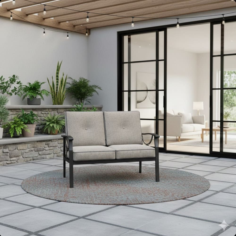 • Elevate your outdoor relaxation with this stylish 48" all-weather loveseat patio sofa in sophisticated black, featuring plush gray cushions for cozy, modern comfort. Perfect for gardens, backyards, porches, patios, balconies, poolside areas, or small outdoor spaces, this 2-seat sofa combines timeless elegance with exceptional durability.