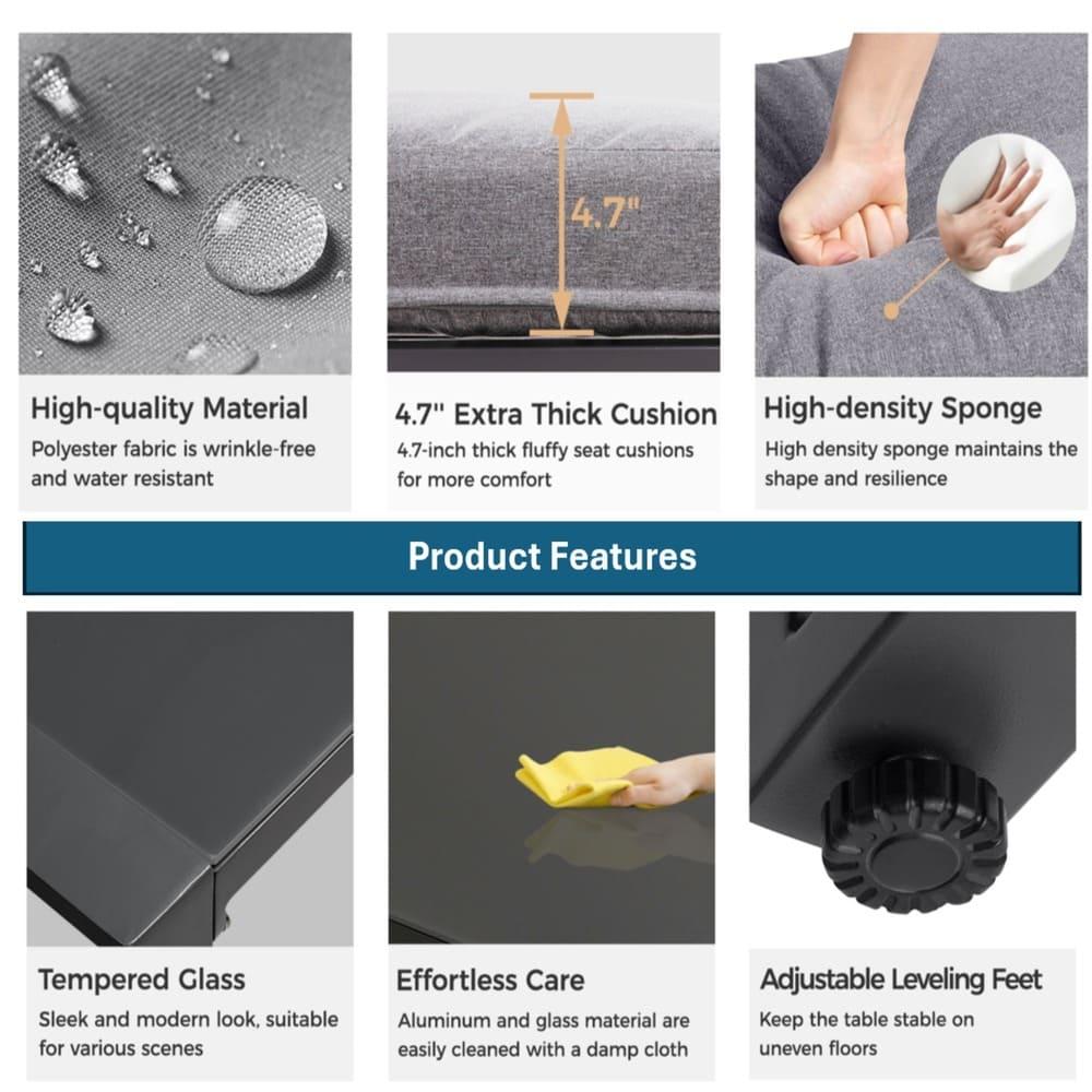 • Easy assembly with simplified structure and included hardware. Low-maintenance design – wipe the frame clean and remove cushion covers for washing. Ideal for couples, small families, apartment dwellers, Airbnb hosts, and anyone seeking stylish, durable outdoor furniture that delivers lasting quality, ergonomic comfort, and effortless elegance.
