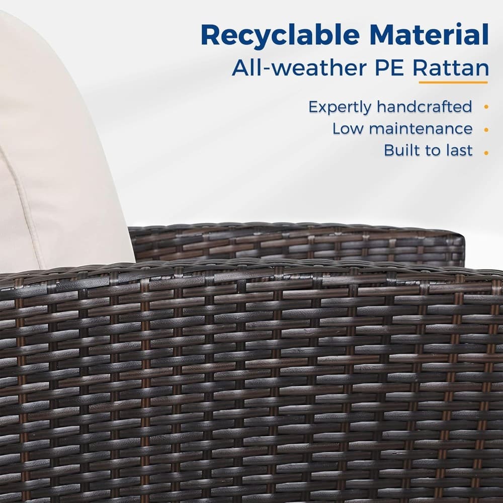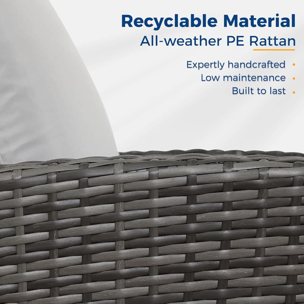 • The robust iron frame provides exceptional stability and rust resistance, while the premium waterproof wicker withstands rain, sun, wind, and temperature extremes without fading or cracking. Upgraded high-density foam cushions (3 inches thick) deliver superior softness and support, with a generous 21-inch seat depth and 3-inch-wide armrests for ergonomic relaxation.