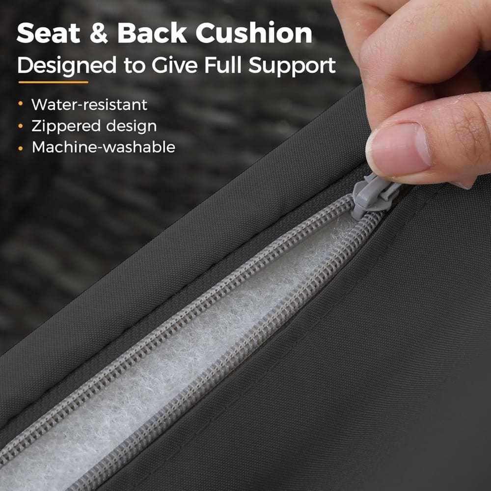 • Premium fabric covers feature advanced dyeing technology to prevent fading, plus smooth zippers for easy removal and machine washing. Modern high-back design elevates any outdoor space with sophisticated elegance, offering a cozy spot for family conversations, reading, or unwinding after a long day. Easy assembly with clear instructions, all hardware, and tools included (faster with two people).