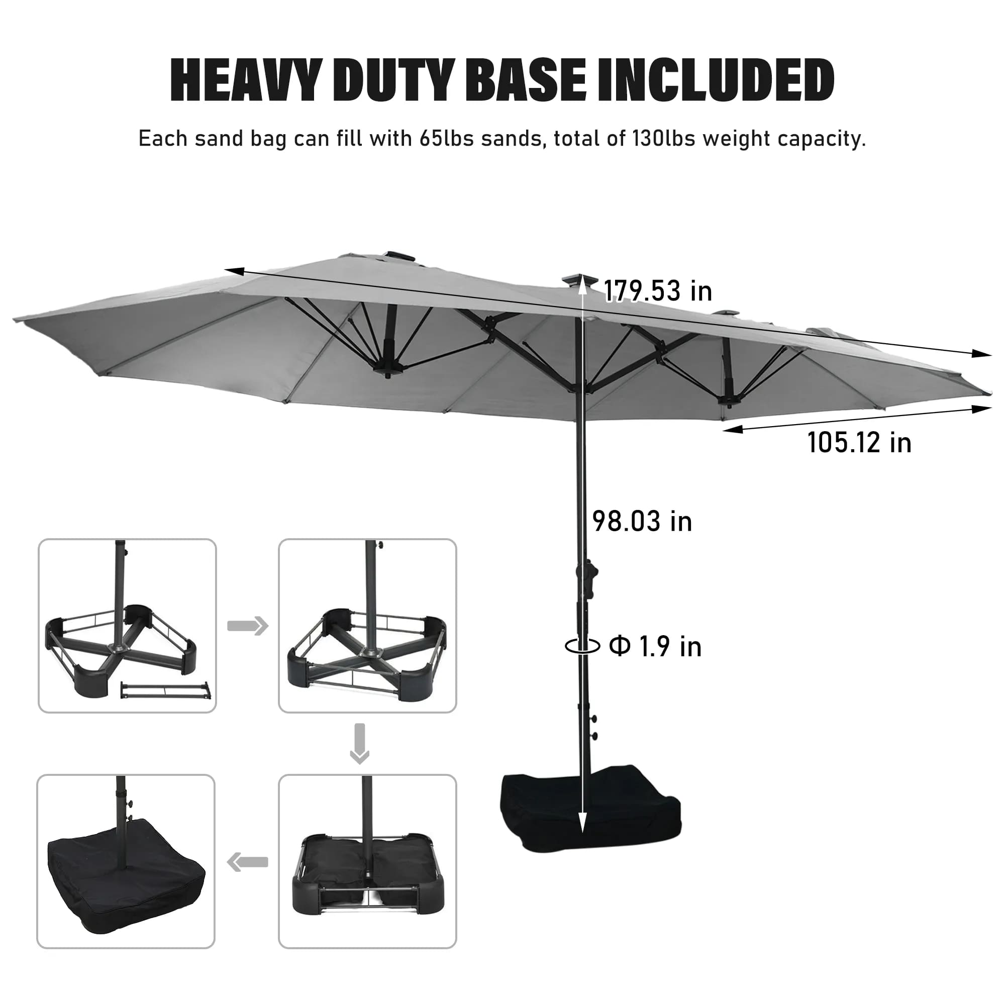 • Includes umbrella base: Iron frame base with two sandbags (sand not included), each sandbag filled with sand can reach 132 pounds.